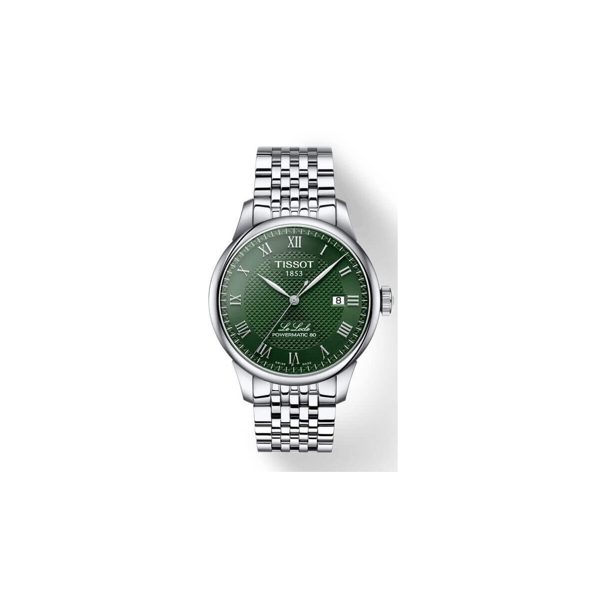 Herrenuhr der Tissot Le Locle-Linie mit Powermatic 80-Uhrwerk, 40-mm-Stahlgehäuse und grünem Zifferblatt, römischen Ziffern und Stahlzeigern