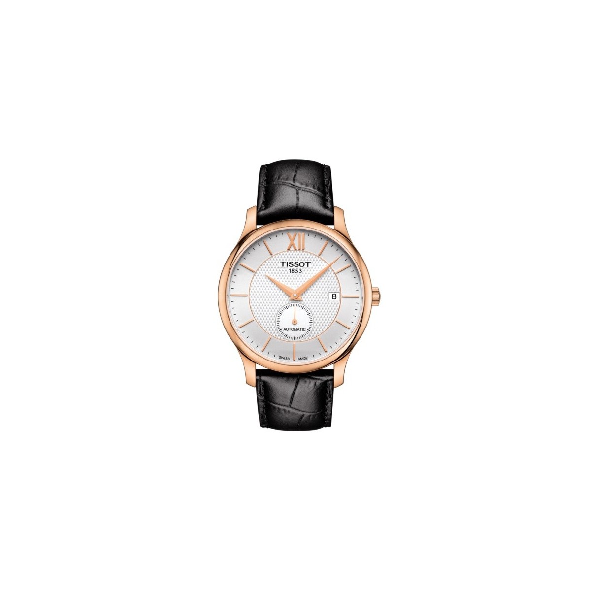 TISSOT TRADITION automatische kleine Sekunde-Referenz: T0634283603800-Swiss made-Garantie: 2 Jahre Garantie-Kollektion: T-Classic-Fall Form: Runde Wasser-Widerstand: resistent gegen 3 bar (30 m/100 ft)-Körper Material: Edelstahlgehäuse 316 L PVD Rosé-Größe Fall: 40 mm-Lug-Entfernung: 20-Fall Höhe: 11,16-Fall Optionen Fall zurück-Gewicht (g): 70,0000-Kristall: Kratzfestes Saphir Kristall-Zifferblatt Farbe : Silber-Indizes: Indizes und Romani-Bewegung: Schweizer Automatik ETA Kaliber Modell 2825-2-1/2-11 ''-Durchmesser (mm): 25,6-Schmuck: reservieren: 25-38 Stunden power Reserve-Band Referenz T600037906-Schnalle: Doppelfaltschließe