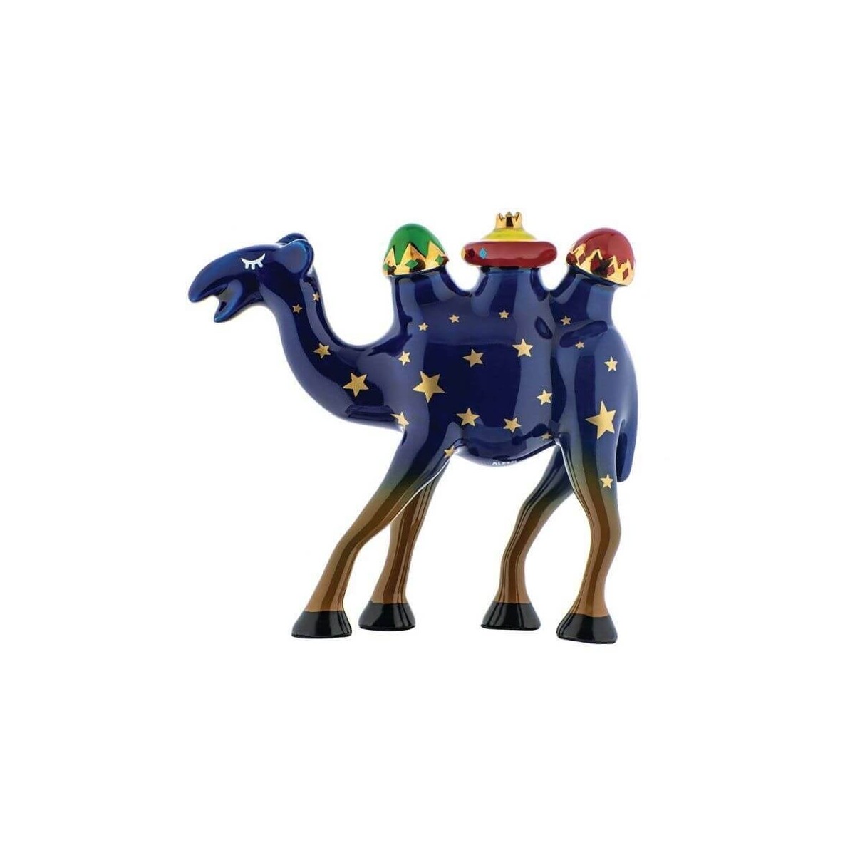 Alessi-Figur verzierte Trino-Krippe aus Porzellan, die ein Kamel darstellt, das wie ein Sternenhimmel mit drei Höckern verziert ist, die den Kopfschmuck der Heiligen Drei Könige darstellen