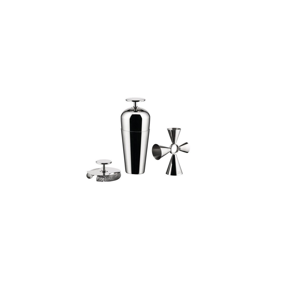 Das Set besteht aus: „parisienne“ Cocktailshaker, Double Bar Strainer und „Quadri Combo Jigger“ komplett aus Stahl.