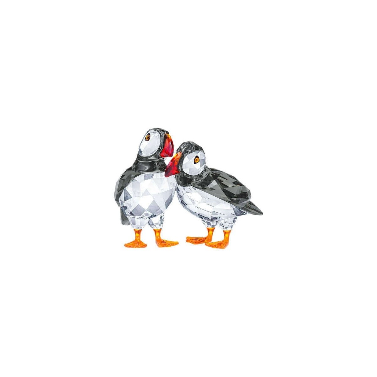Paar Papageientaucher von Swarovski aus der Kollektion Feathered Beauties, entworfen von Martin Zendron und hergestellt aus klarem Kristall mit schwarzen, roten und orangefarbenen Details, sehen sich an.