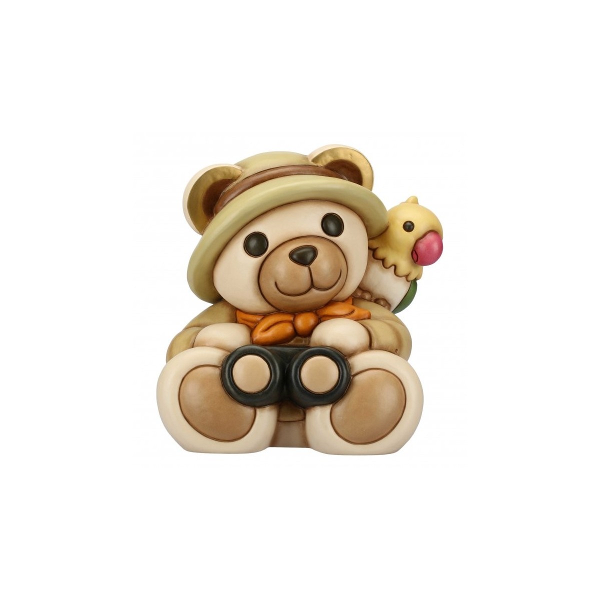 Teddy-Linie Tropischer Champagner-farbener Entdecker mit grüner Weste und Hut, schwarzem Fernglas und buntem Papagei auf der Schulter.