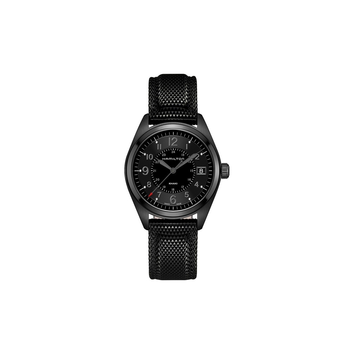 Herren Khaki Feld Zeile mit Quazo Bewegung, Swiss Made, schwarz PVD Stahl RS 40 mm, schwarzes Zifferblatt mit rund um die zweite Nummerierung und Stoff und Leder-Armband