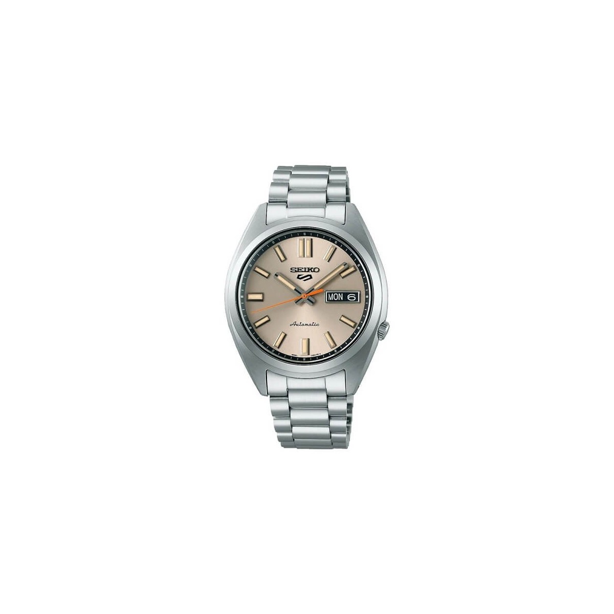 Line 5 Sportuhr, Automatikwerk Kaliber 4R36. Uhr mit Stahlarmband und 37,4 mm SNXS-Gehäuse, beiges Zifferblatt.