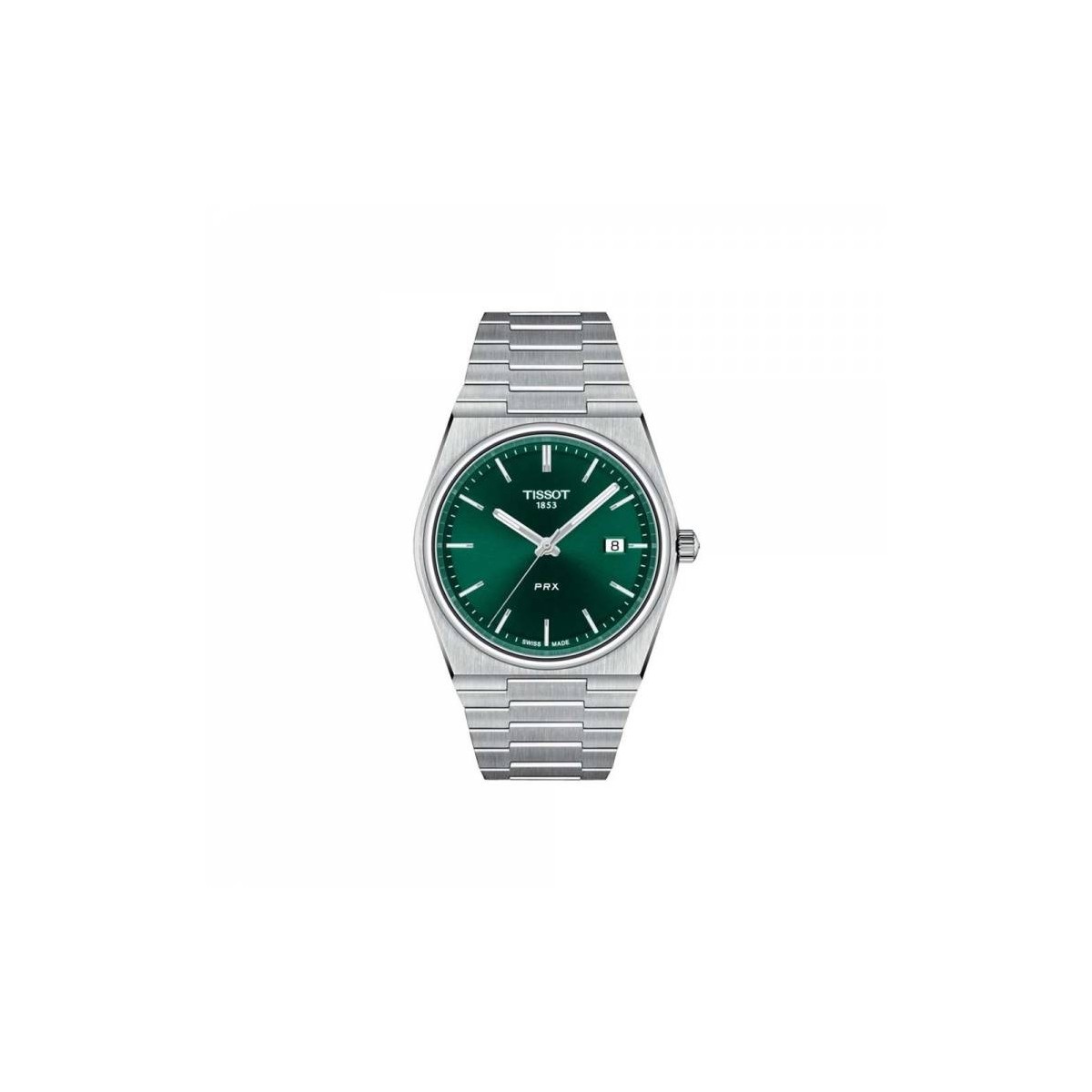 Tissot Herrenuhr aus der Prx-Kollektion mit Zeitfunktion und Automatikwerk. Die Uhr besteht aus 316L-Stahl mit einem polierten und satinierten Mesh-Armband, einem 40-mm-Stahlgehäuse, einem kratzfesten und entspiegelten aufrechten Saphirglas und einem grünen Zifferblatt mit SuperLumiNova-Zeigern. Datum bei 3 Uhr und Gehäuseboden mit sichtbarem Uhrwerk.