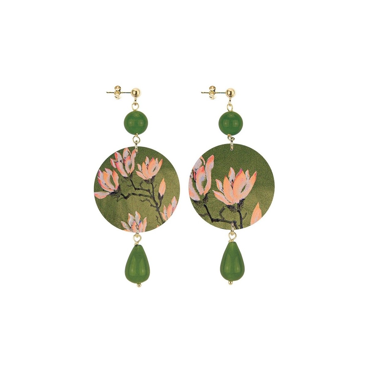 Ohrhänger mit Natursteinen und farbenfrohen Gelbgold-Messingdrucken, neue Kollektion Circle, Fantasy-Lotusblüte und olivgrüner Fuß