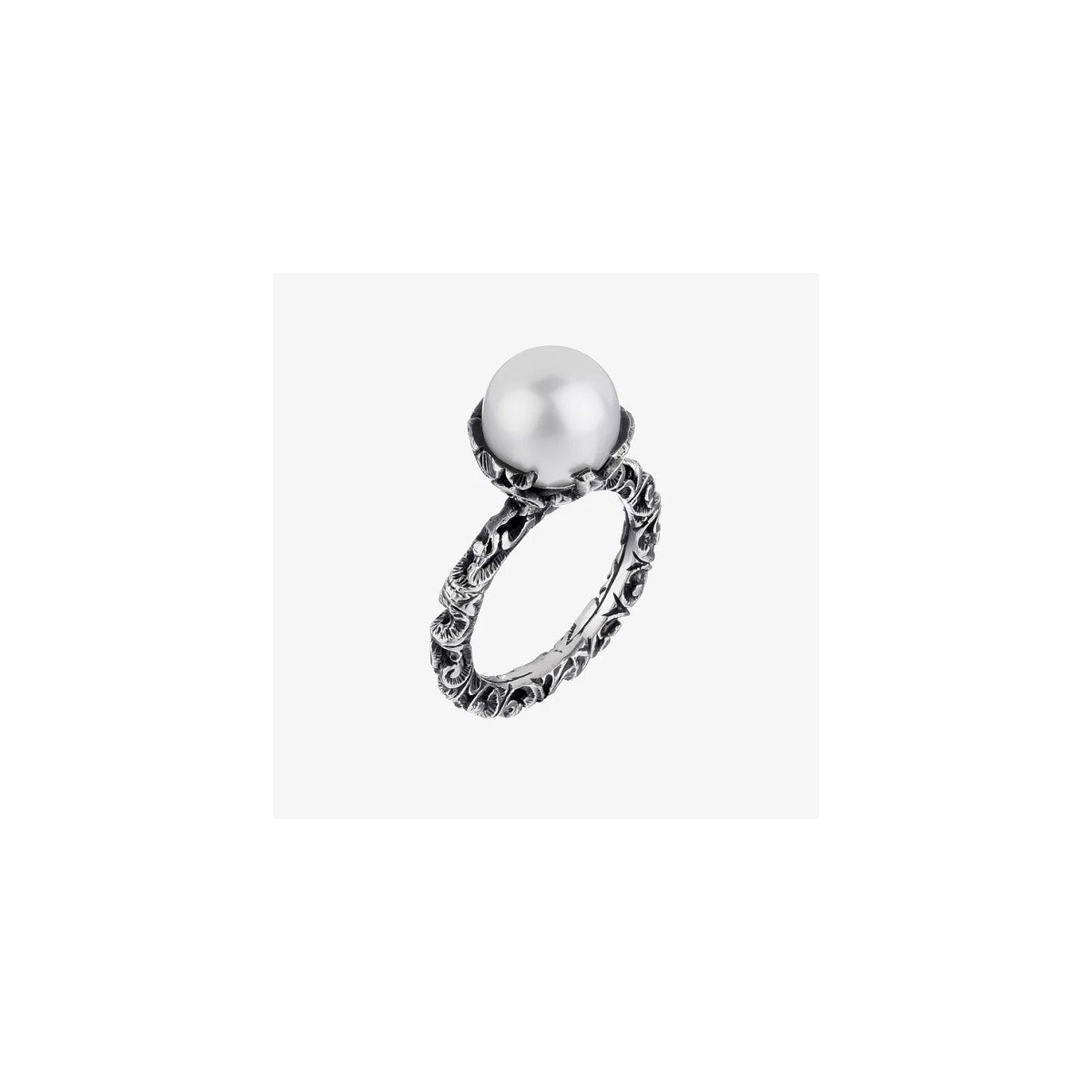 Der Ring aus der Pura-Kollektion mit eingelegter Schiene ist mit einer weißen Perle verziert, umgeben von dekorativen Arabesken aus brüniertem Silber, die einen Hauch von Charme und Eleganz verleihen.