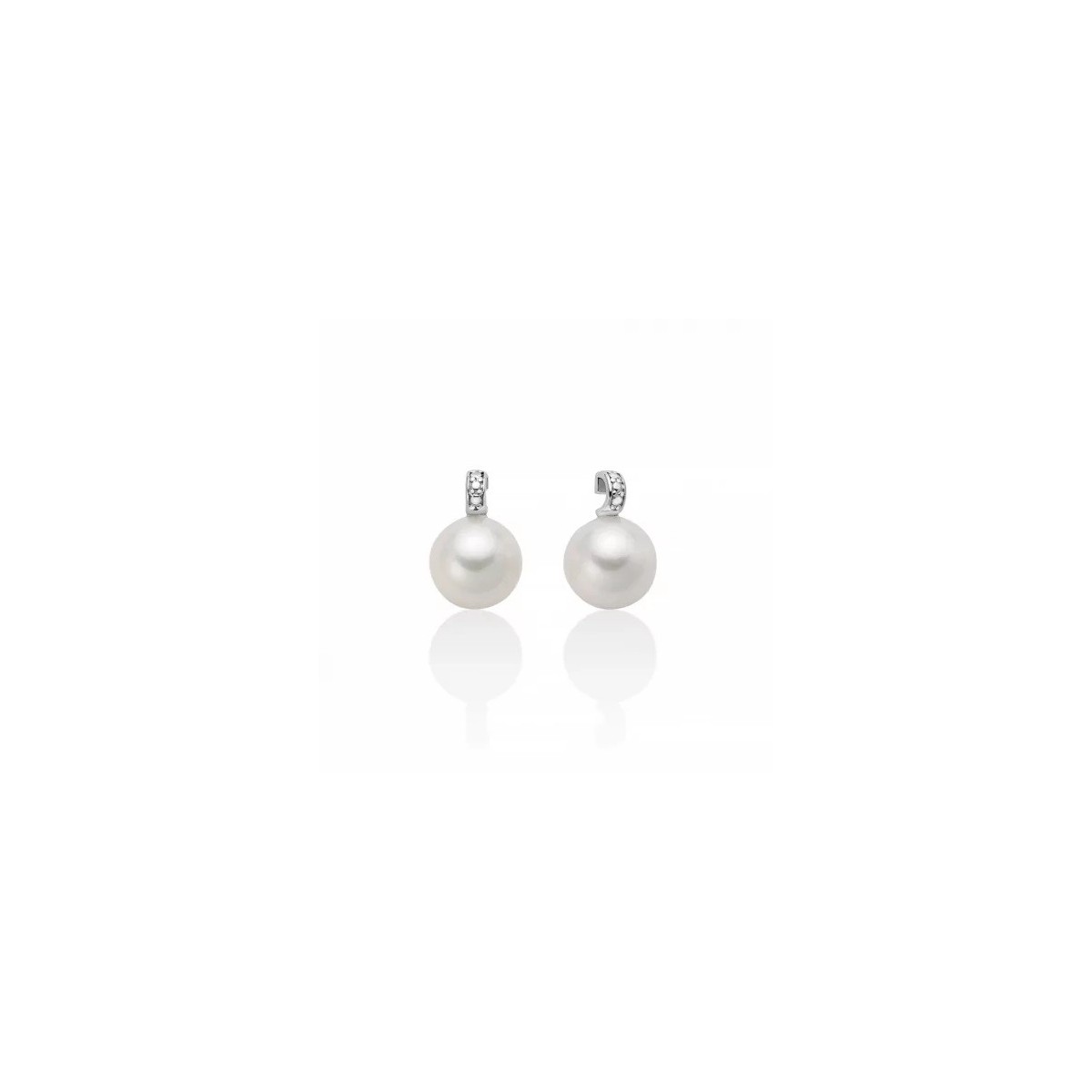 Miluna Damenohrringe aus der Le Perle-Kollektion, hergestellt aus 18 Karat Weißgold mit zwei weißen Süßwasser-Zuchtperlen mit einem Durchmesser von 7 - 7,5 mm, verziert mit einem Diamanteffektmotiv, das die Reinheit der Perle hervorhebt, Stiftverschluss.