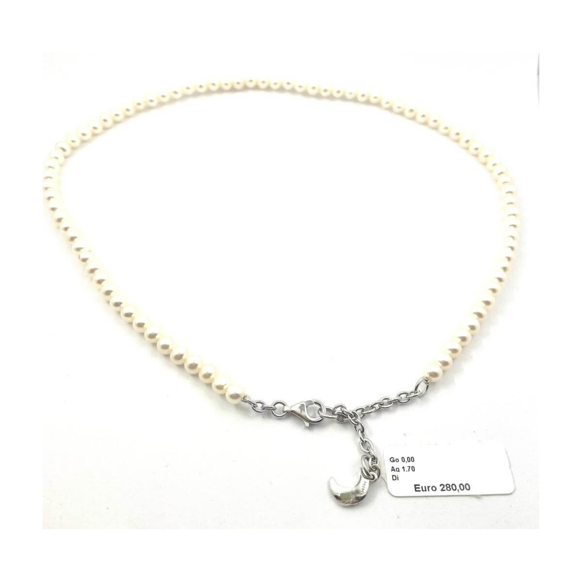 Weiße Perlenkette aus der neuen elastischen Linie mit Verschluss, Logo und mondförmigem Anhänger in 925er Silber