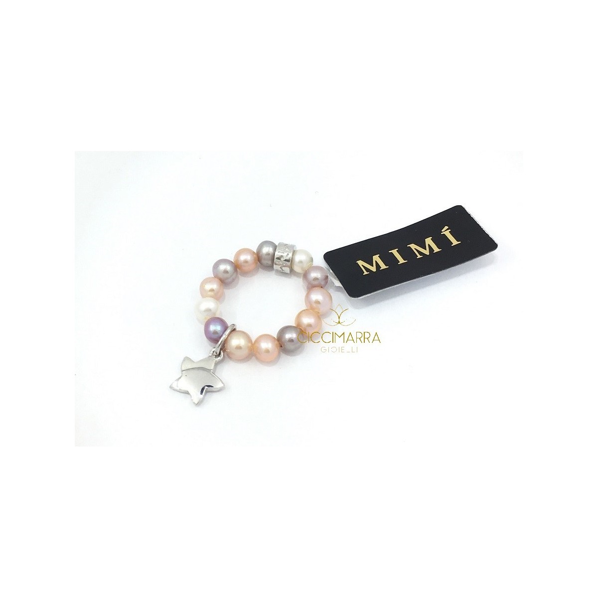 Variante des klassischen elastischen Ringes mit Anhänger in Silber 925 in Form eines Sterns, kombiniert mit einer Multicolor Zuchtperle mit dem kleinen Logo Mimi