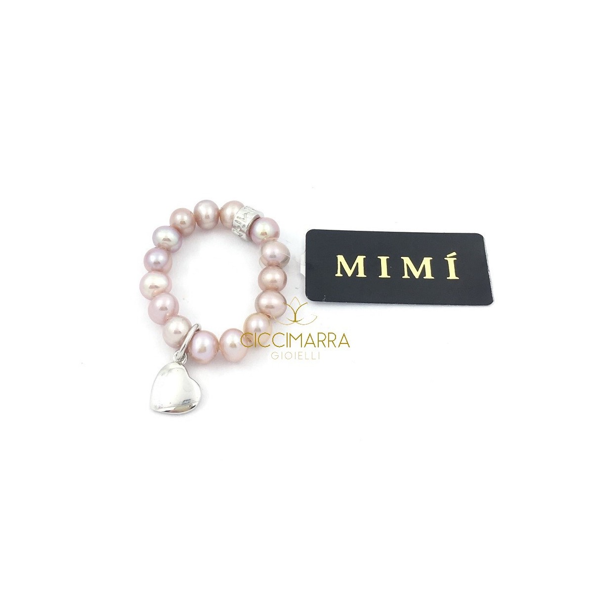 Variante des klassischen elastischen Ringes mit einem herzförmigen Anhänger aus 925 Silber, kombiniert mit einer Zuchtperle von lila-violetter Farbe mit dem kleinen Logo Mimi
