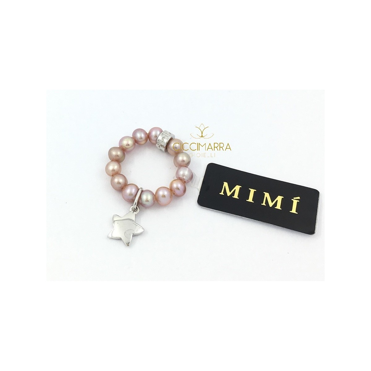 Variante des klassischen elastischen Ringes mit einem sternförmigen Anhänger aus 925 Silber, kombiniert mit einer Zuchtperle von lila-violetter Farbe mit dem kleinen Logo Mimi