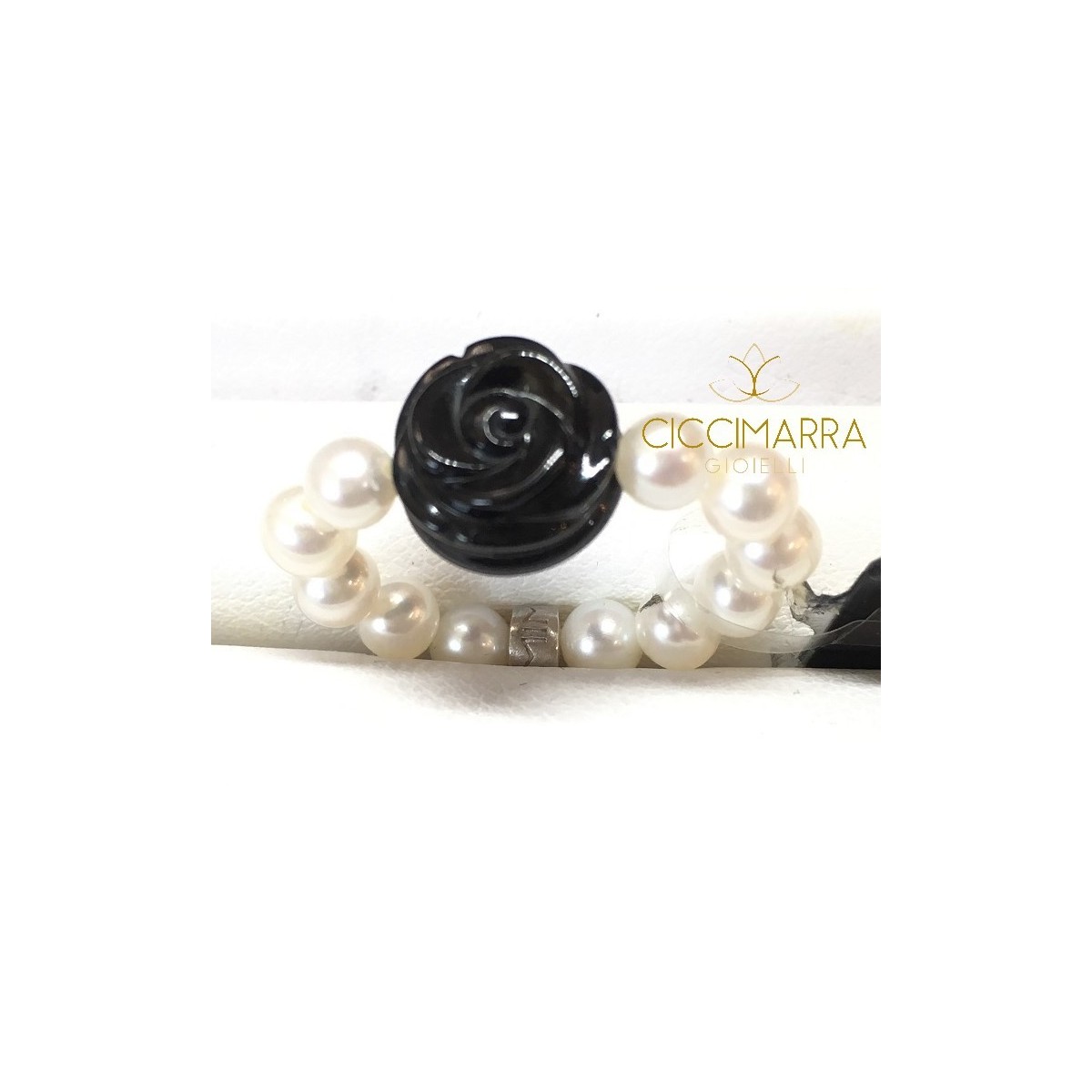 Elastica Line Ring in weißen Perlen mit zentralen Rose in schwarzem Achat und Silber Mimì Daddel - A023GO-WP