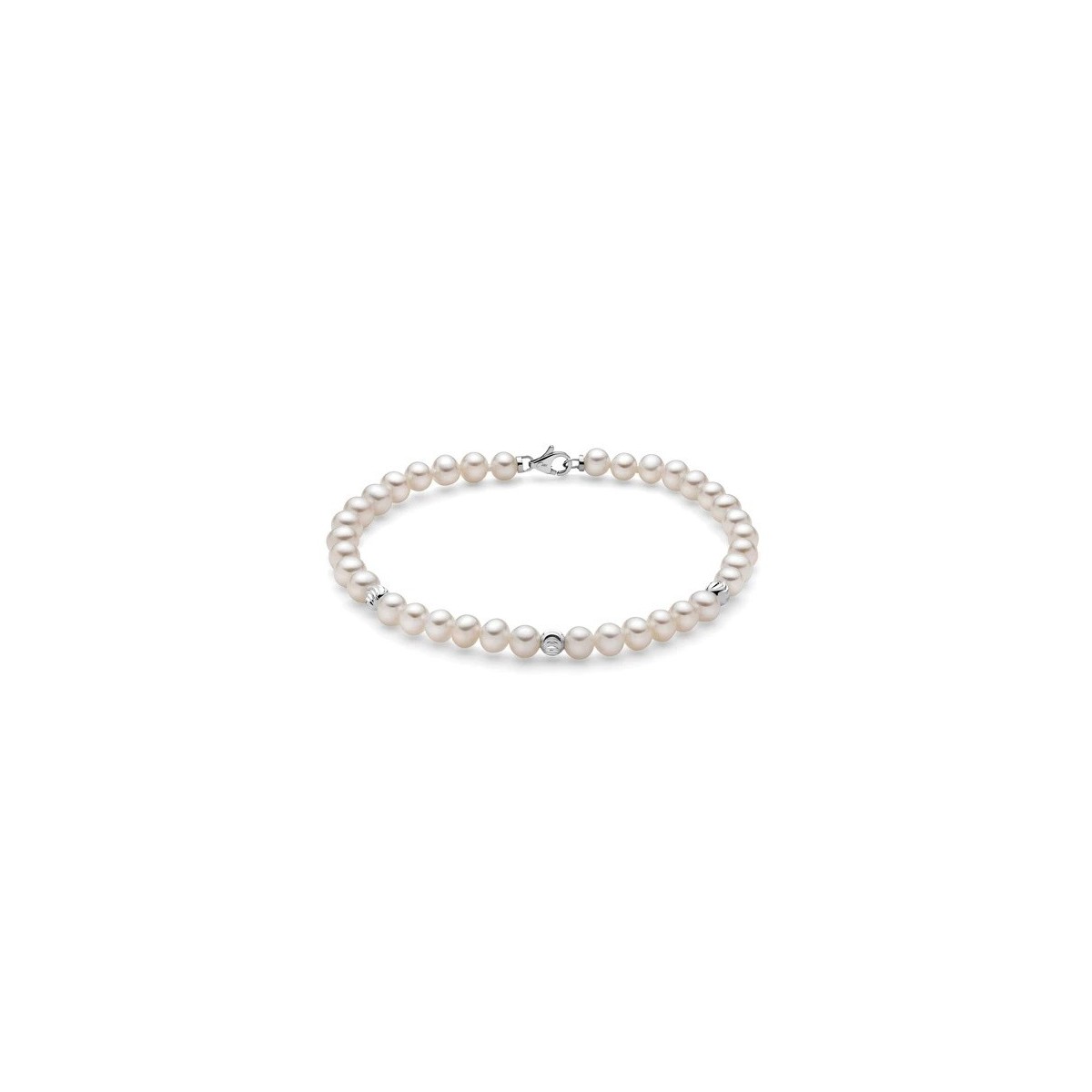 Miluna Damenarmband aus der Kollektion Perle Boule und Fantasia aus 18 Karat Weißgold mit einer Kette aus weißen Orientperlen mit einem Durchmesser von 4,5 - 5 mm, die durch das Vorhandensein von drei Weißgoldkugeln mit Diamanteffekt verziert sind, die Glanz verleihen zum Juwel.