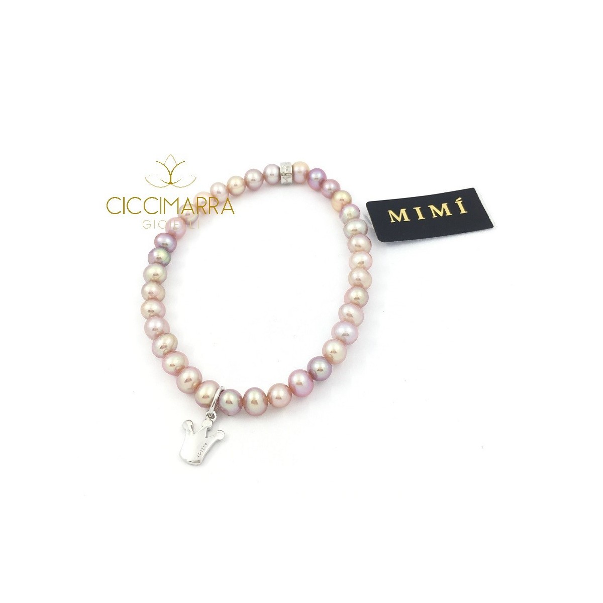 Variante des klassischen elastischen Armbandes mit einem 925 Silber Anhänger in Form einer Krone, kombiniert mit einer Zuchtperle in lila Farbe mit dem kleinen Logo Mimi