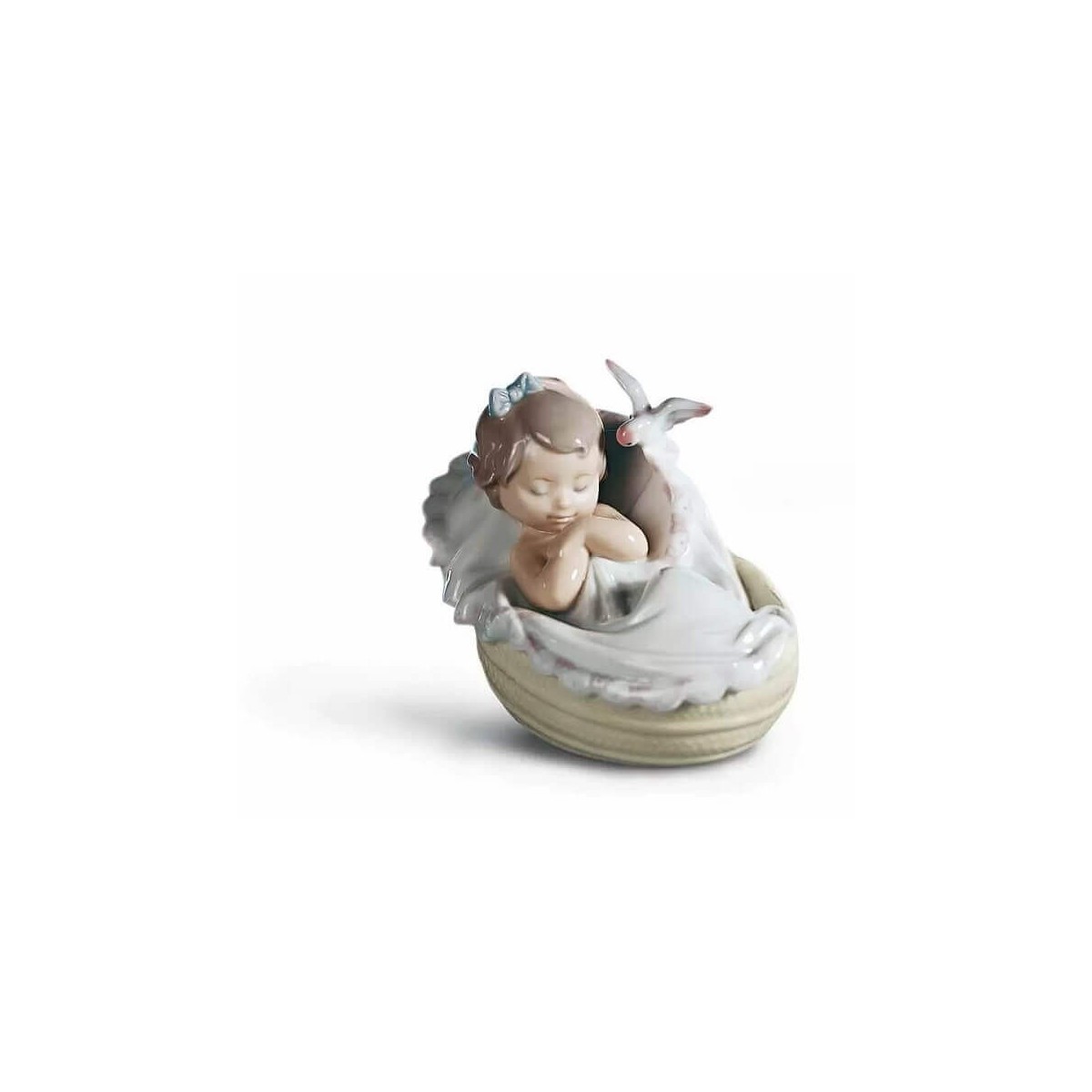 Skulptur eines kleinen Mädchens in Wiege von Sogni D'oro aus glänzendem Porzellan LLadrò