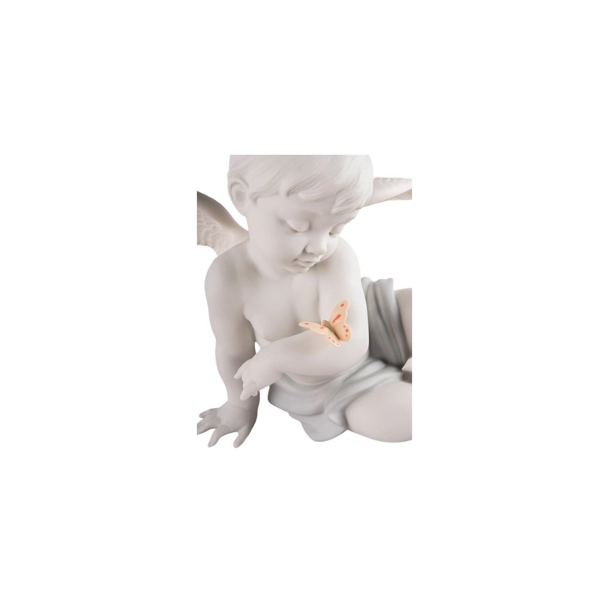 Lladrò Künstlerische Skulptur aus undurchsichtigem Porzellan, die einen Engel mit einem Schmetterling auf dem Arm darstellt, entworfen von Josè Santaeulalia.