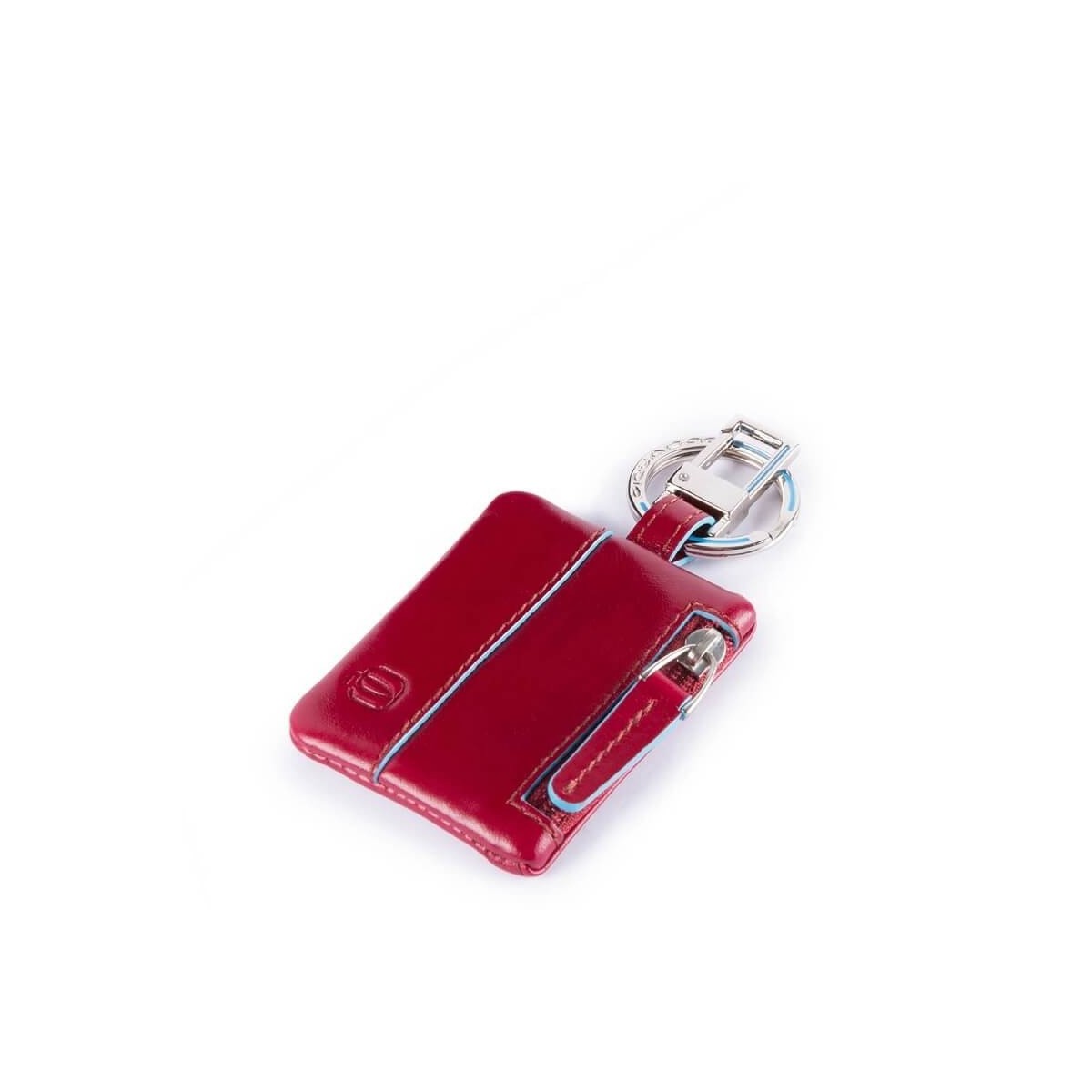 Piquadro-Schlüsselanhänger aus der Black Square-Kollektion aus rotem Rindsleder mit feiner Narbung und weicher Haptik mit sichtbaren hellblauen Nähten und mit Connequ-Vorrichtung, ausgestattet mit einer Tasche mit Reißverschluss und poliertem Metallring.