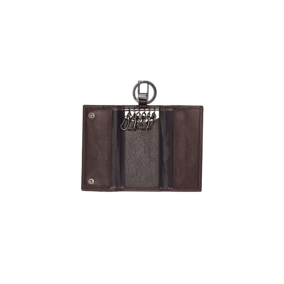 Schlüsselanhänger aus braunem Leder, Linie Pulse, mit Knöpfen und Karabinerhaken.