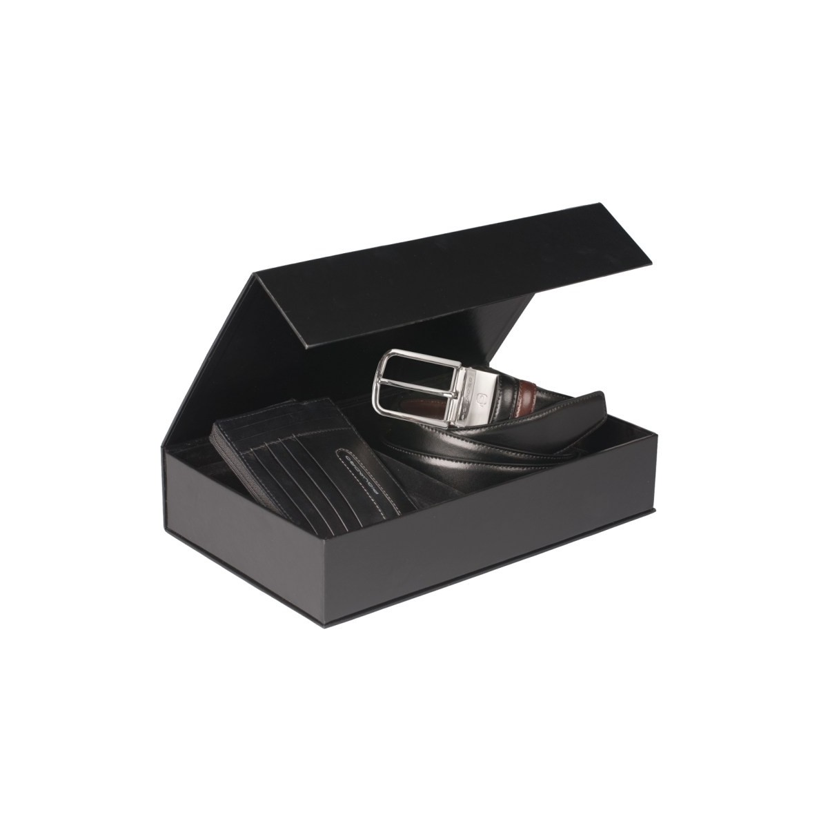 Piquadro-Geschenk-Box mit PU1243FW Mannes Brieftaschen und Gürtel mit Schnalle schwarz/dunkel braun