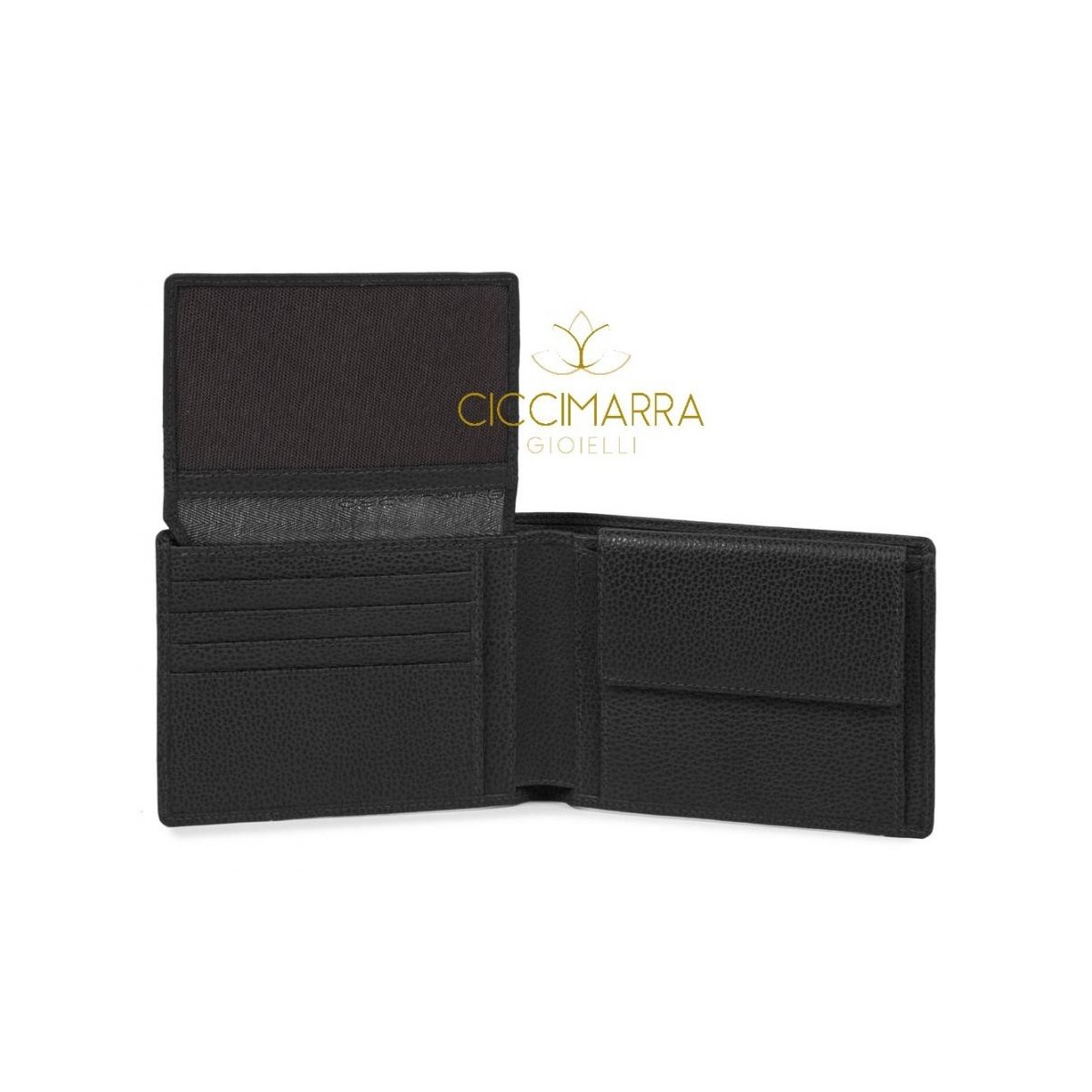 Herrenbrieftasche aus schwarzem Leder mit Dokumentenhalter, Münzfach und Kreditkartenetui. Die Erse-Linie zeichnet sich durch zwei unterschiedliche Verarbeitungen des Leders aus, vollnarbiges Kalb, eines mit einem "Reiskorn", das ebenfalls einen zweifarbigen Effekt ergibt, und einen glatten und halbglänzenden. Das Zubehör besteht aus gunmetalfarbenem Metall.