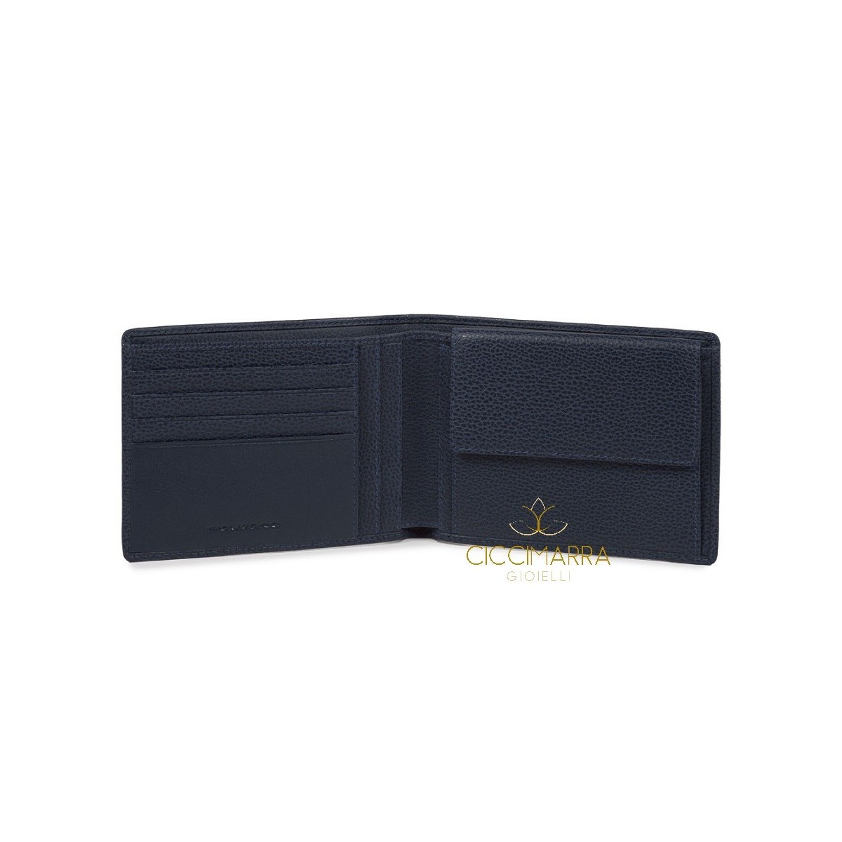 Herrenbrieftasche aus blauem Leder mit Münzfach. Die Erse-Linie zeichnet sich durch zwei unterschiedliche Verarbeitungen des Leders aus, vollnarbiges Kalb, eines mit einem "Reiskorn", das ebenfalls einen zweifarbigen Effekt ergibt, und einen glatten und halbglänzenden. Das Zubehör besteht aus gunmetalfarbenem Metall.