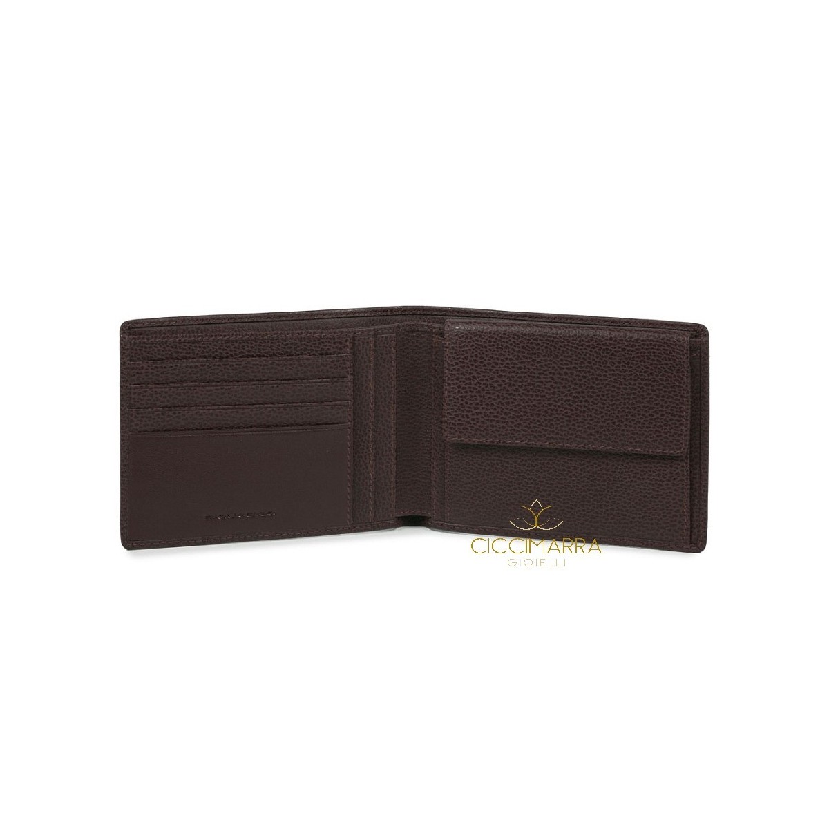 Herrenbrieftasche aus dunkelbraunem Leder mit Münzfach. Die Erse-Linie zeichnet sich durch zwei unterschiedliche Verarbeitungen des Leders aus, vollnarbiges Kalb, eines mit einem "Reiskorn", das ebenfalls einen zweifarbigen Effekt ergibt, und einen glatten und halbglänzenden. Das Zubehör besteht aus gunmetalfarbenem Metall.