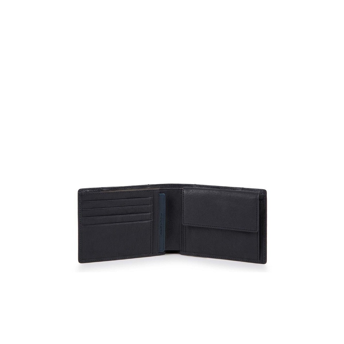 Blau mit Geldbeutel und RFID-Schutz vor Betrug. Die kurze Linie besteht aus pflanzlich gegerbtem, vollnarbigem Kalbsleder mit einer inhomogenen Optik aufgrund des handwerklichen Waschverfahrens, kombiniert mit einem wasserabweisenden technischen Gewebe. Alle Modelle haben Design-Metall-Zubehör mit einer doppelten Rotguss-Oberfläche und einem gebürsteten Metall-Einsatz, markiert Piquadro.