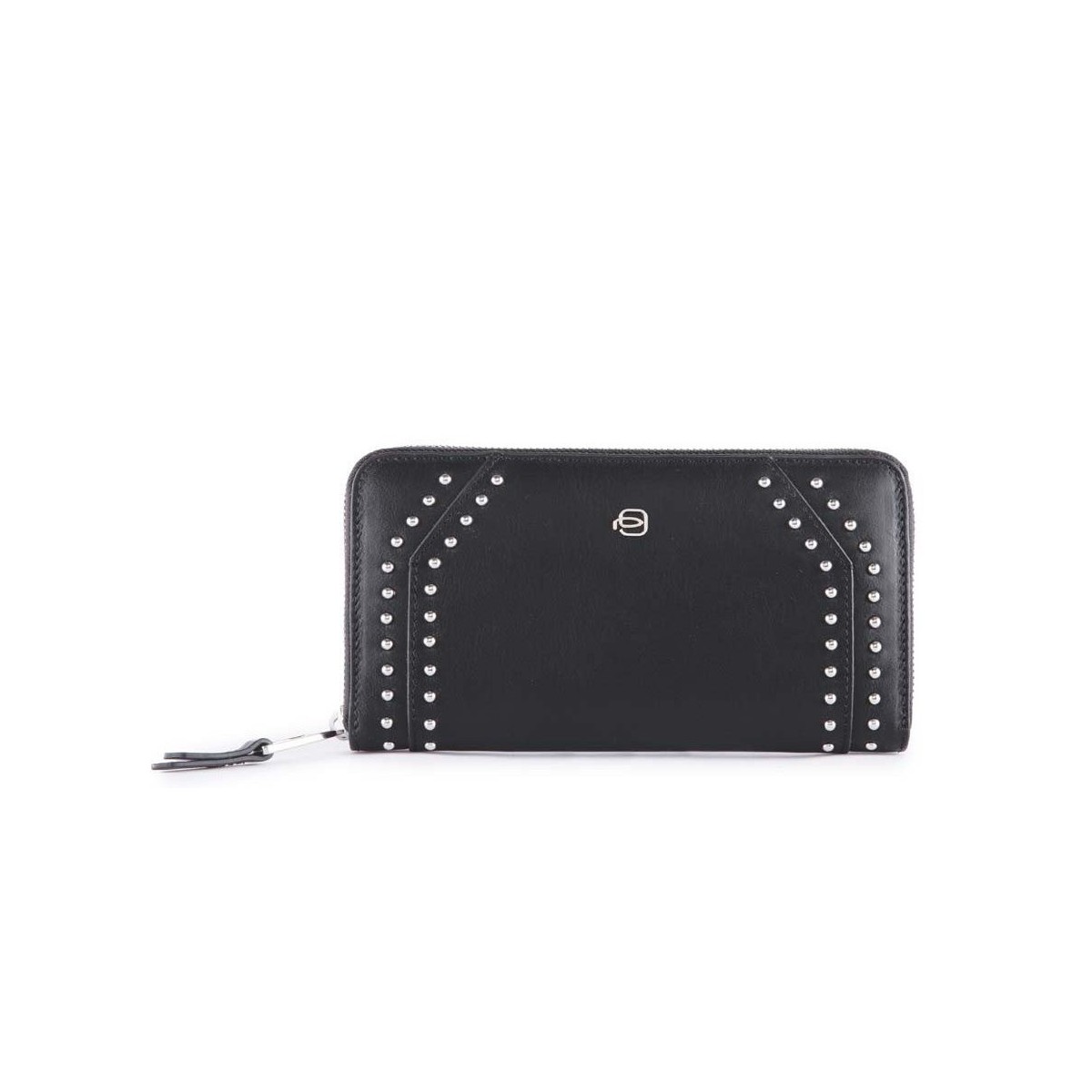 - Damenbrieftasche 4 mit Reißverschluss geschlossener Faltenbalg mit Münzfach, Kreditkartenetui, RFID-Betrugsbekämpfung der Muse-Linie in schwarzem Leder mit Nieten. Die Muse-Kollektion besteht aus ausschließlich weiblichen Taschen und Accessoires mit metallischen Details mit glänzendem Finish.