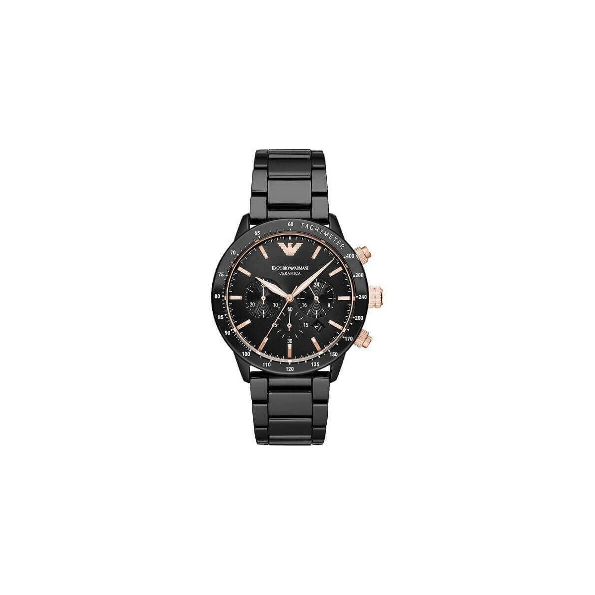 Herren-Chronograph aus dem Hause Emporio Armani mit Zeitfunktion und Quarzwerk. Die Uhr ist aus schwarzer Keramik mit glänzendem Finish mit einem runden Gehäuse von 43 mm Durchmesser und 11 mm Dicke, einem schwarzen Sonnenschliff-Zifferblatt mit roségoldfarbenen Stabindizes und einem schwarzen Armband mit Faltschließe.
