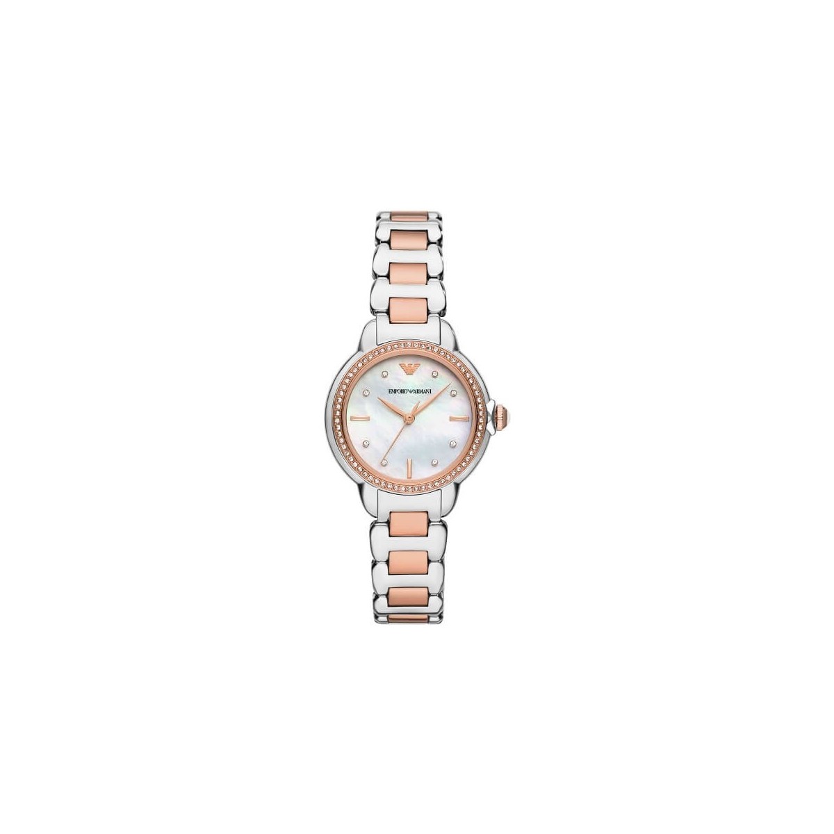 Damenuhr Modell Emporio Armani Mia mit Nur-Zeit-Funktion und 3-Zeiger-Quarzwerk. Die Uhr verfügt über ein Armband aus Stahl und zentralen Gliedern mit Roségoldbeschichtung, ein rundes 32-mm-Gehäuse mit glänzender Silberoberfläche und ein Perlmuttzifferblatt.