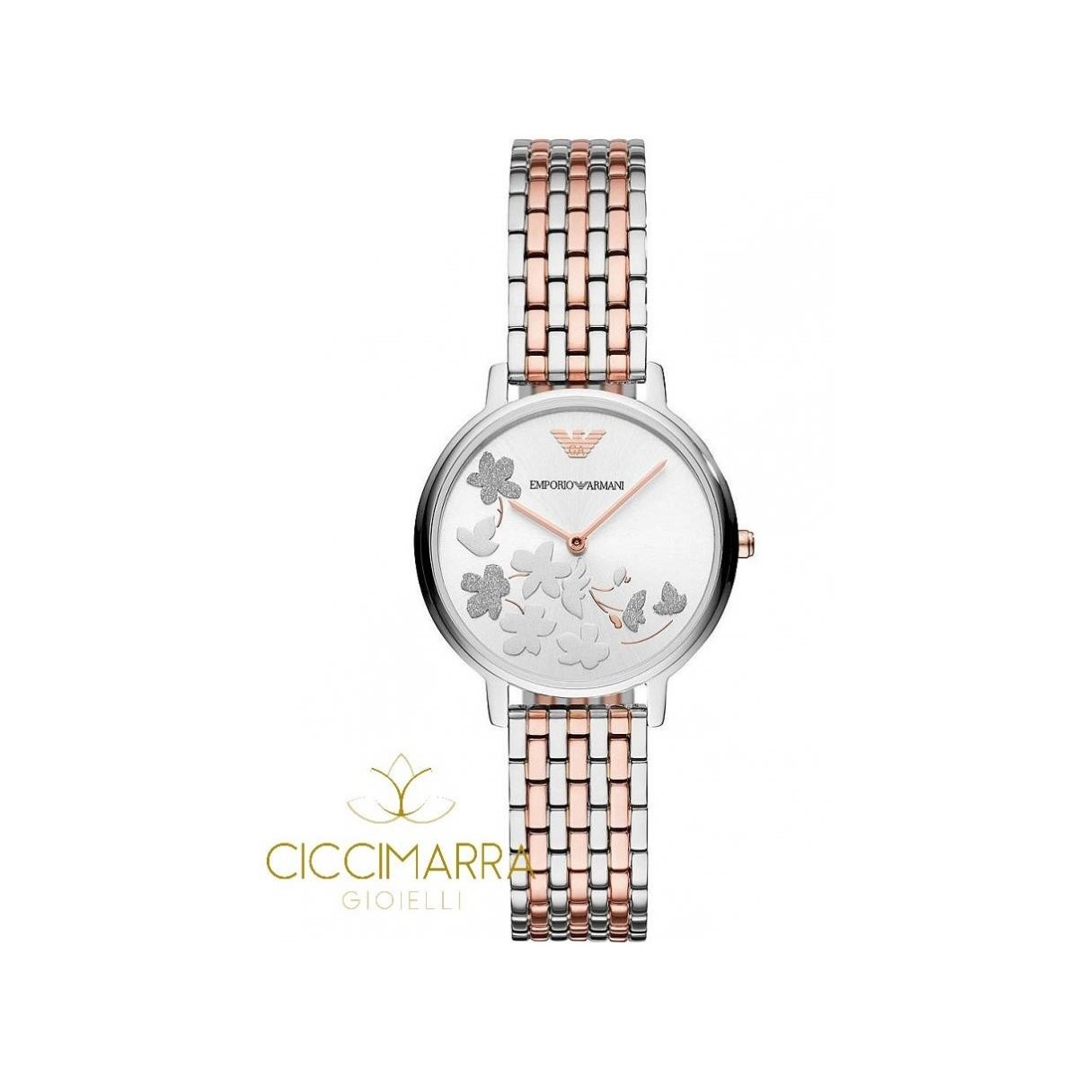 Silbernes Edelstahlgehäuse mit einem Durchmesser von 32 mm und einer Dicke von 6 mm mit einer festen Ringmutter; Silbernes Zifferblatt mit Glitzerblättern Dekoration ohne Zahlen oder Indizes und mit roségoldenen Zeigern. Das Armband ist aus bicolor Edelstahl, Silber und Roségold mit Faltschliesse.