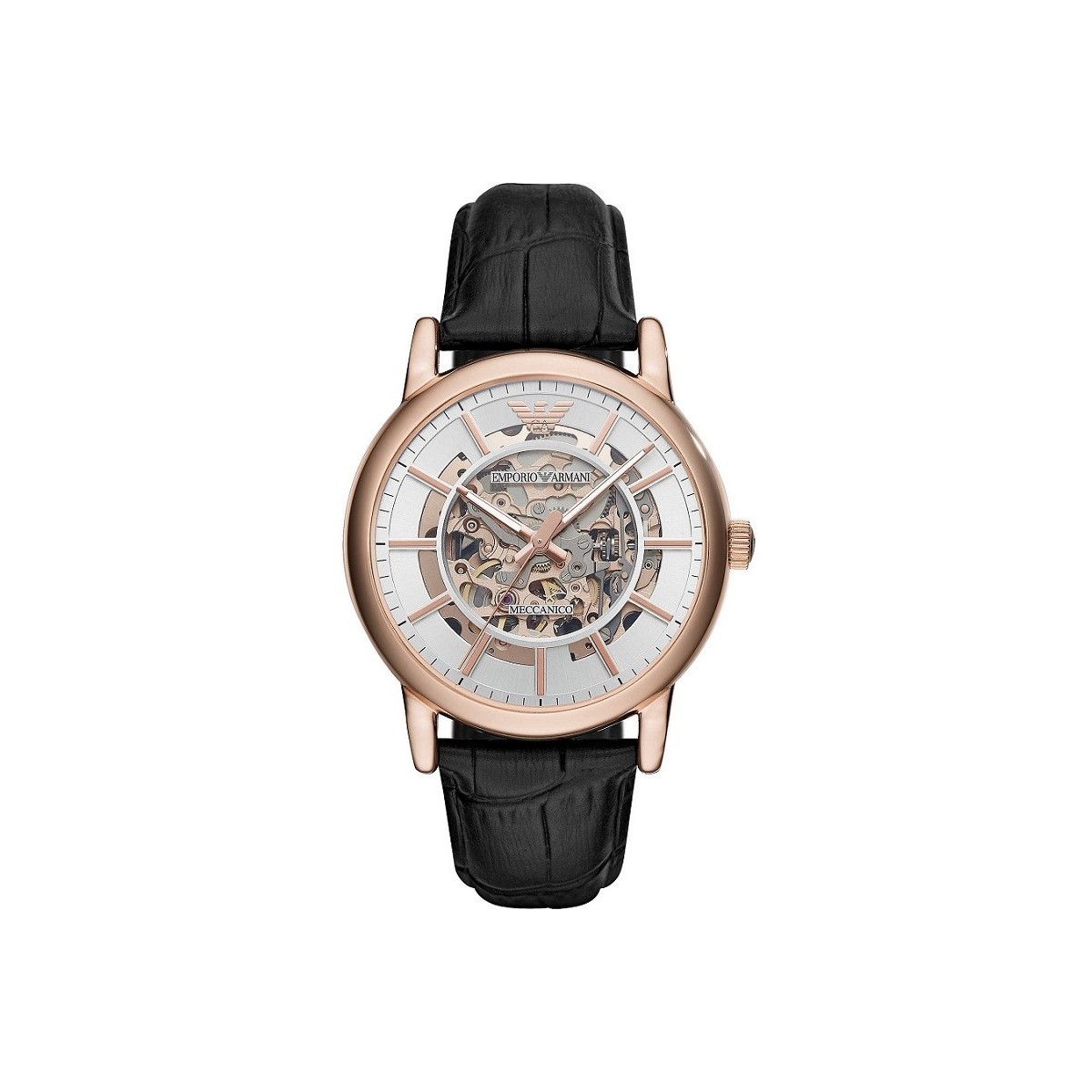 Stil und Eleganz mit einer Bewegung der Aufregung verkörpert diese von dem berühmtesten italienischen Designer Giorgio Armani entworfene Uhr Eleganz und Kultiviertheit, mit einem rosévergoldeten Stahlgehäuse und einem skelettierten Zifferblatt mit sichtbaren Bewegungen. Das Armband ist aus schwarzem Kalbsleder mit Krokoprägung.