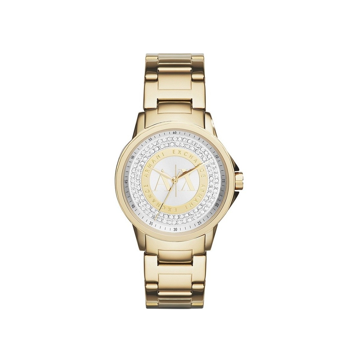 Armani watch only time of the Exchange line for women with steel case and gold metal strap, quartz movement and dial with crystals.