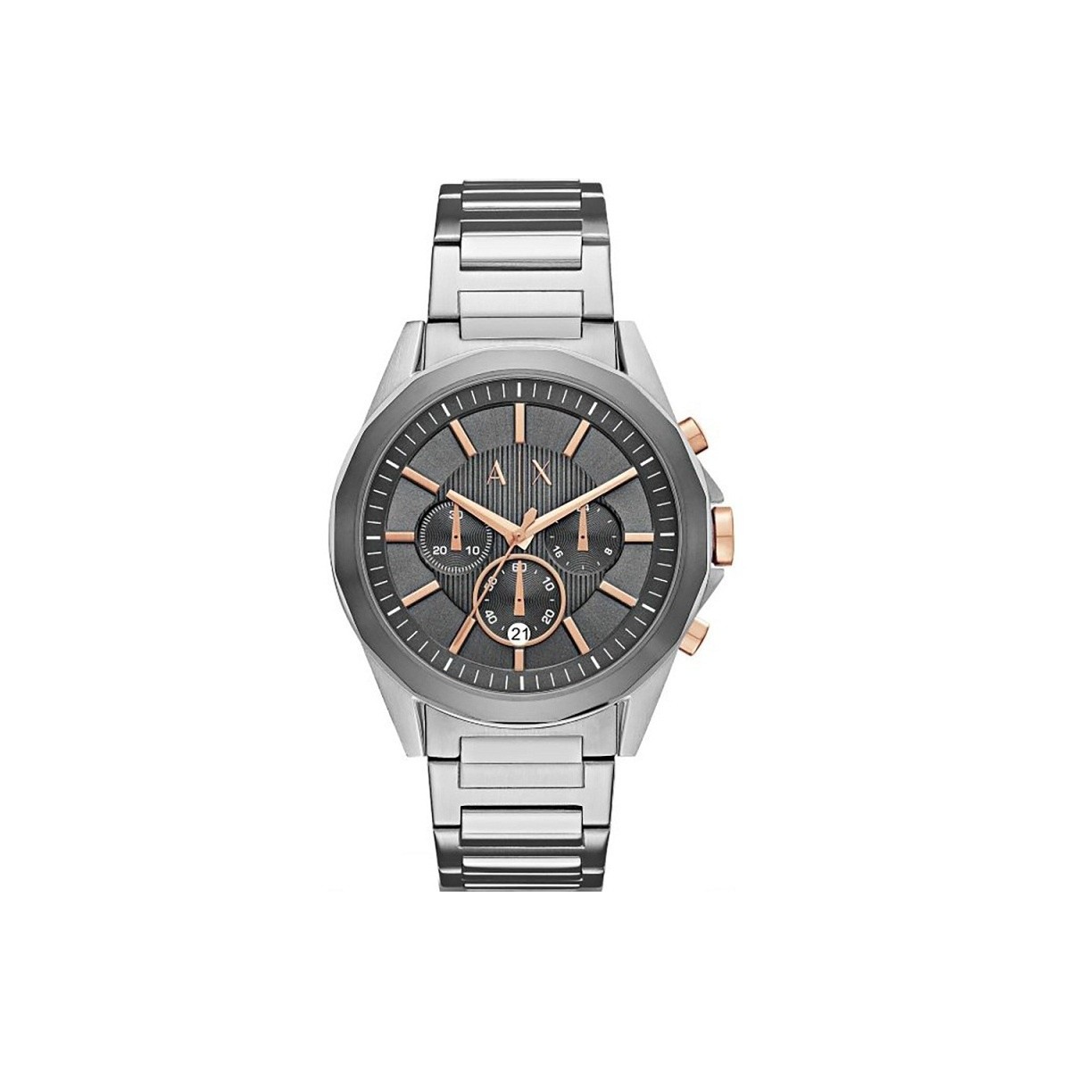 Armani Uhr Chronograph der Exchange-Linie für Männer mit Edelstahlgehäuse und Band, graues Zifferblatt mit Rosé-Marker und Zeiger.