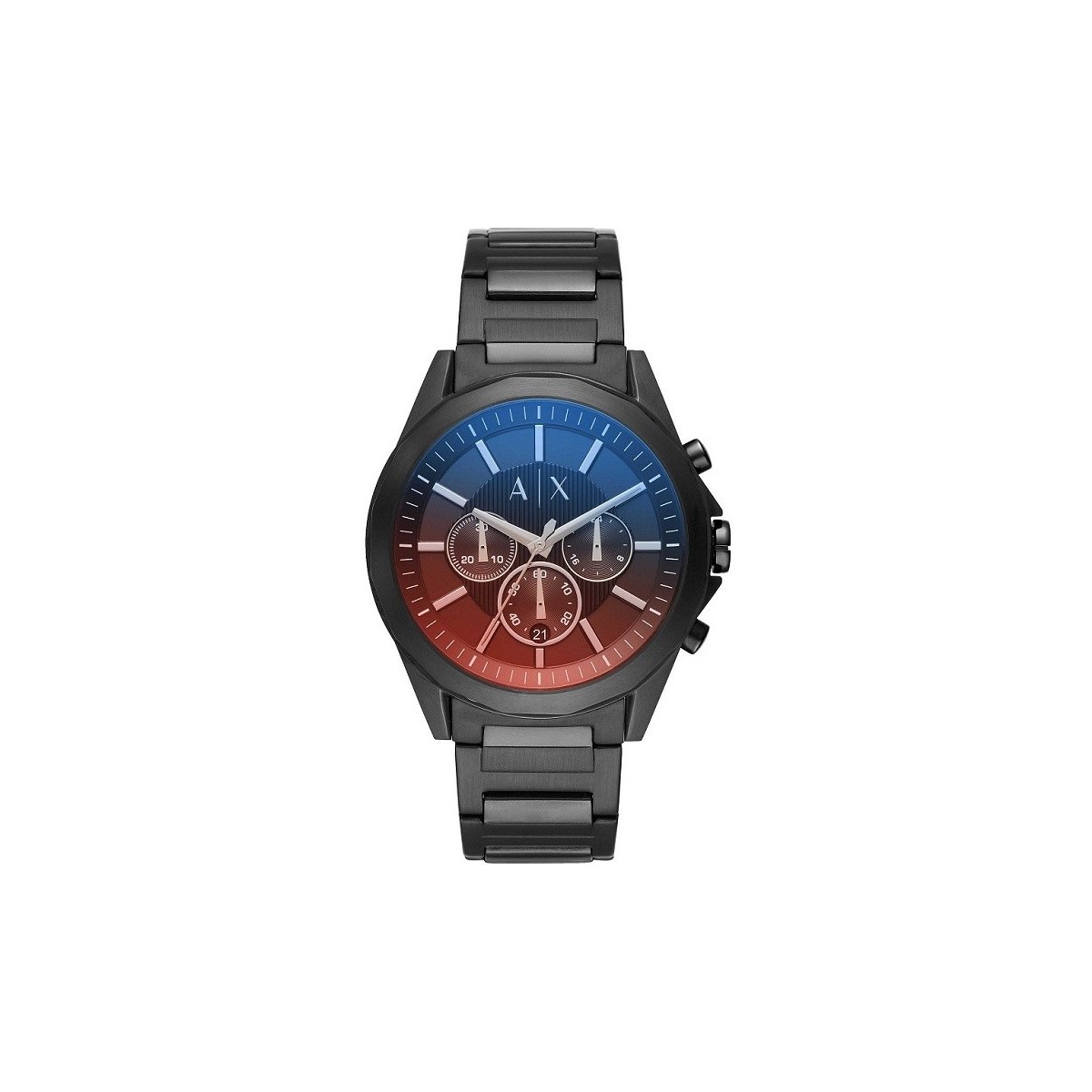 Armani Uhr Chronograph der Exchange-Linie für Männer mit Gehäuse und Armband aus schwarzem Stahl, schwarzes Zifferblatt mit schillernden Glas.