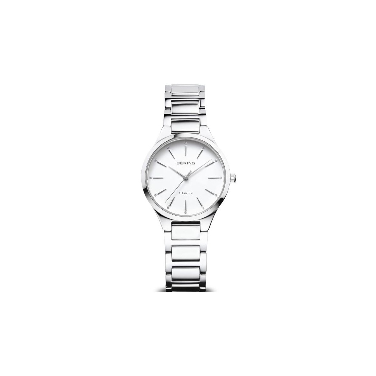 Bering Titanuhr mit weißem Zifferblatt und Strasssteinen auf den Indexen.