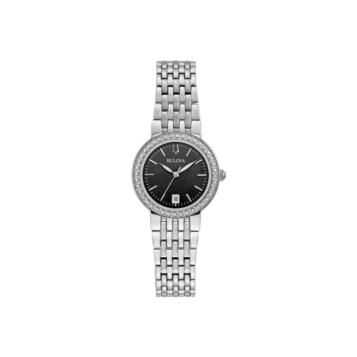 Bulova Damenzeituhr aus Stahl aus der Classic Lady Diamond Kollektion. Quarzwerk, Lünette mit Diamanten und Saphirglas.
