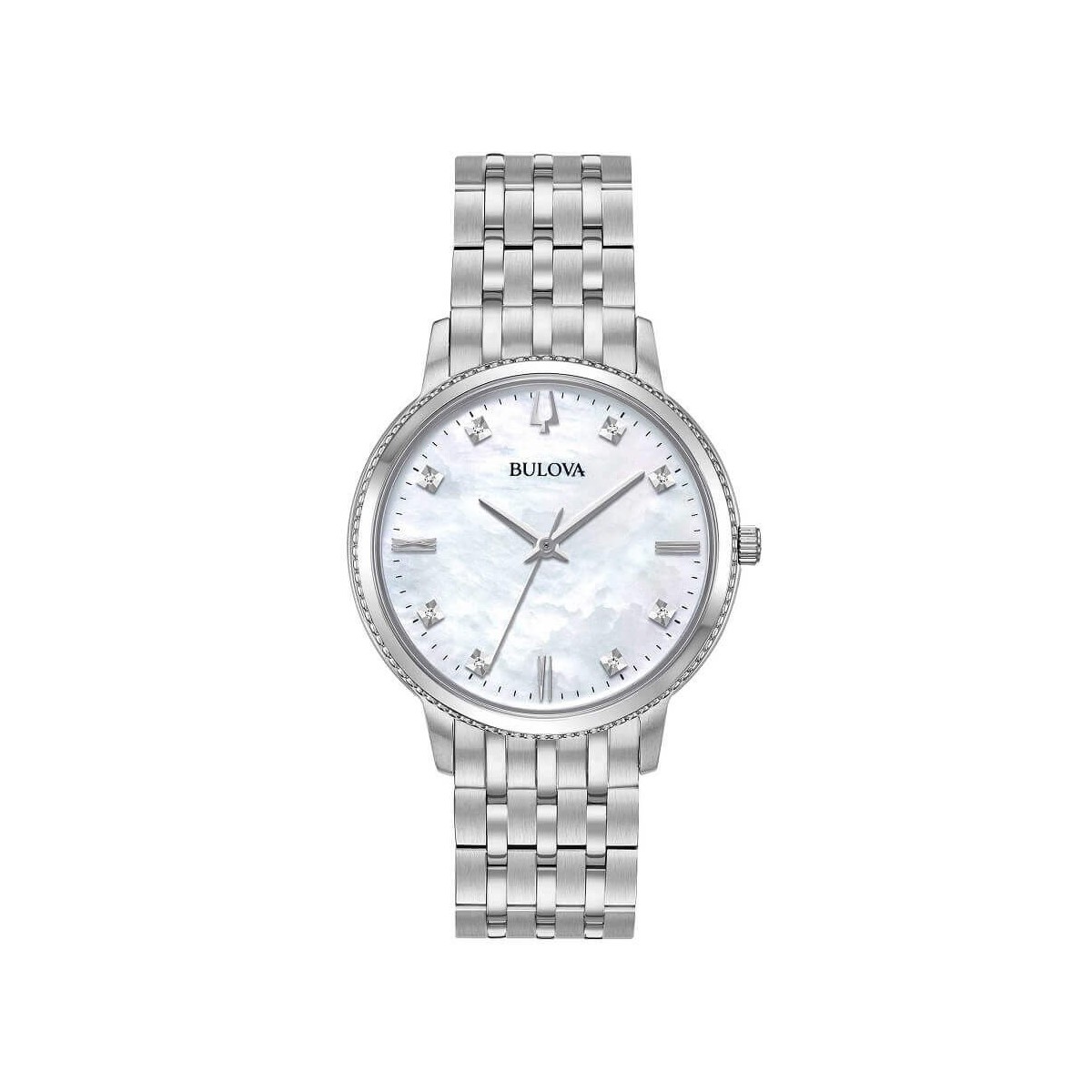 Die Bulova Classic Uhr mit Quarzuhrwerk, Stahlgehäuse und Metallarmband, mit weißem Perlmuttzifferblatt und 8 handgesetzten Diamanten stellt einen zeitlosen und eleganten Klassiker dar, der für jeden Frauentyp geeignet ist.