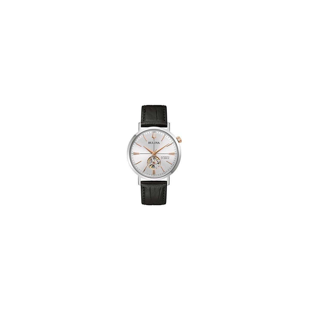 Time only Herrenuhr aus der Aerojet Kollektion. Automatikwerk, Stahlgehäuse, Rosé-Indizes, schwarzes Lederarmband und Mineralglas.
