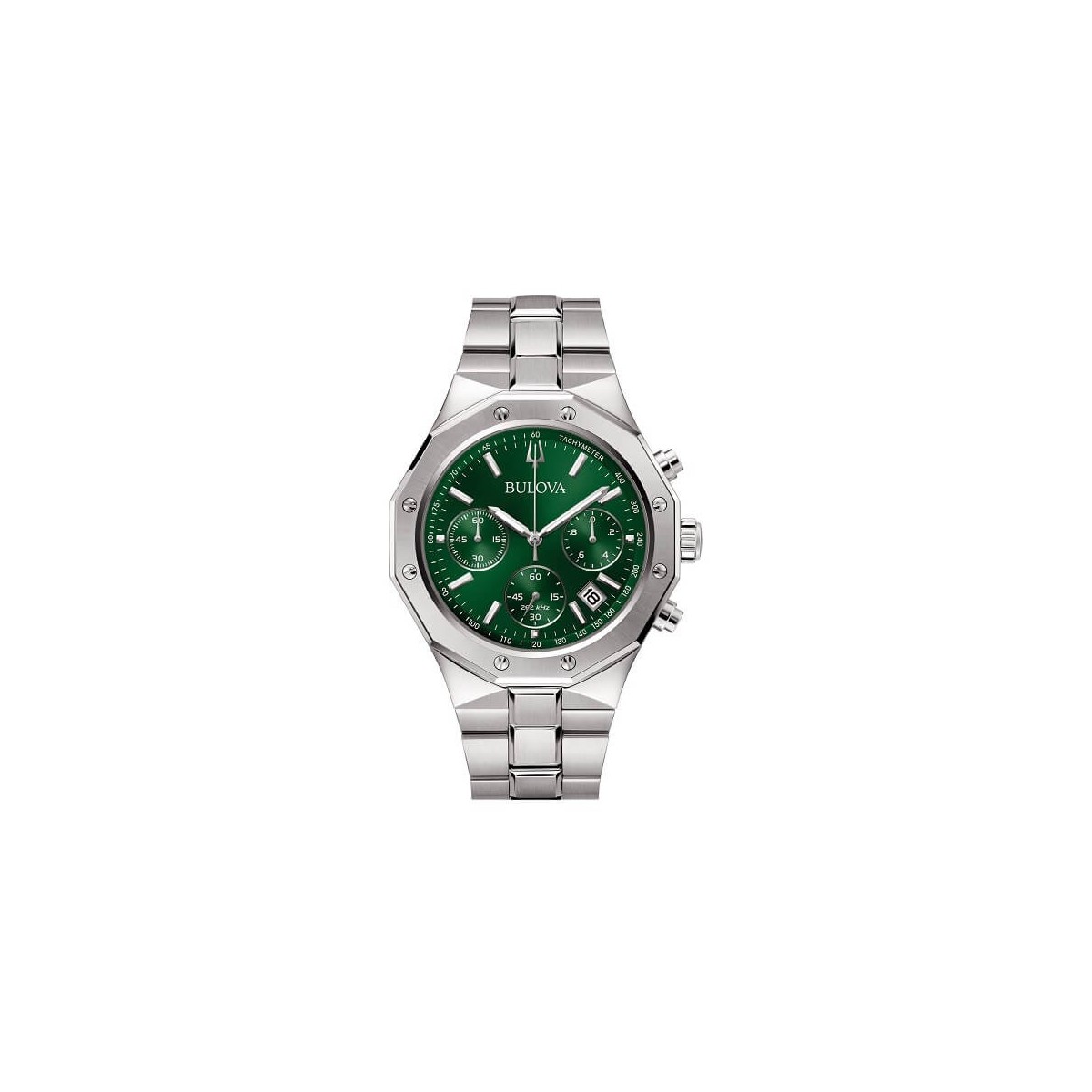 Die Bulova Octagon Chrono-Uhr mit 262-kHz-Hochfrequenz-Präzisions-Chronographenwerk, das sich durch die kontinuierliche Bewegung des Sekundenzeigers, Stahlgehäuse und Stahlarmband mit grünem Zifferblatt auszeichnet, stellt einen zeitlosen und eleganten Klassiker dar, der für jeden Manntyp geeignet ist.