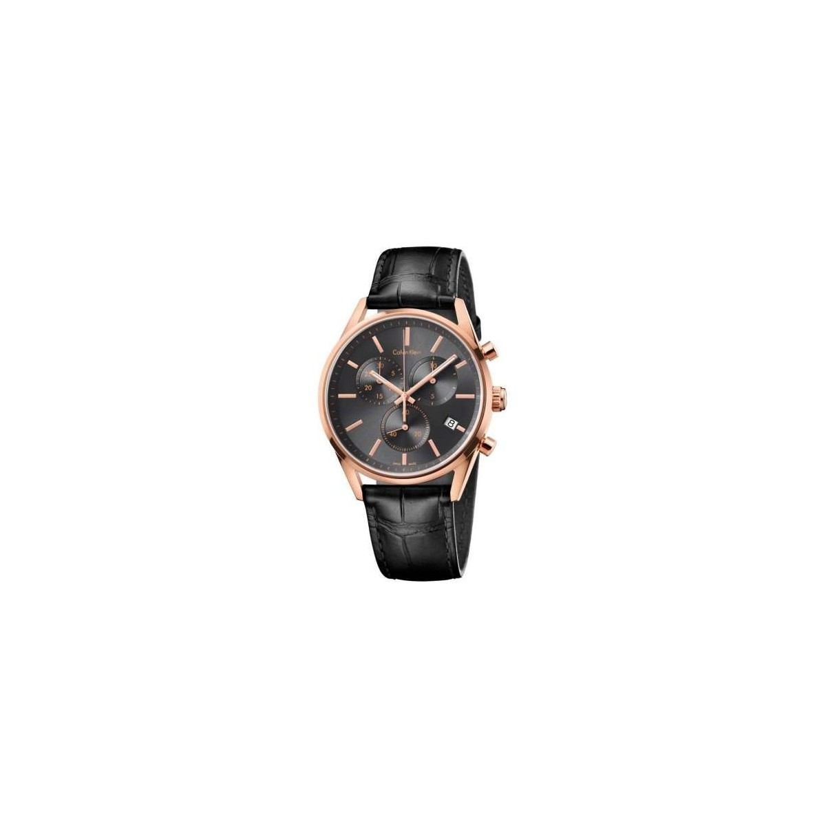 Herren Chronograph Armbanduhr mit PVD rose Gehäuse und schwarzem Zifferblatt, Quarzwerk und Lederarmband mit Krokoprint