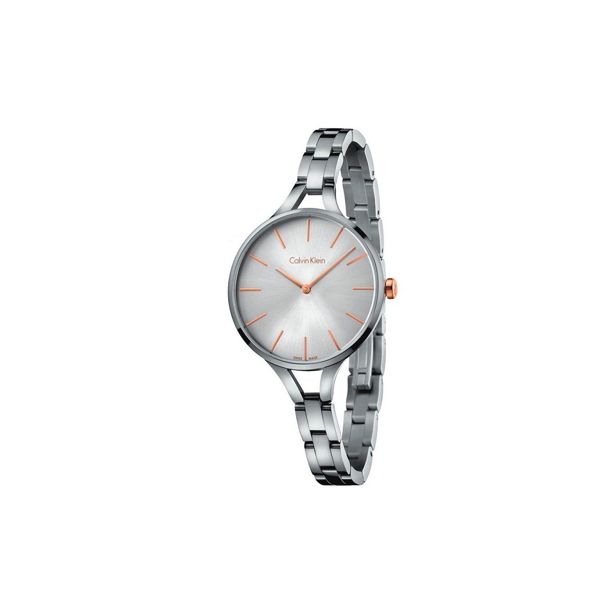 Grafik-Uhr mit Edelstahlgehäuse und -Armband, weißes Zifferblatt mit angewandten Indizes und Hände rosa gold Pvd, Quarz-Uhrwerk