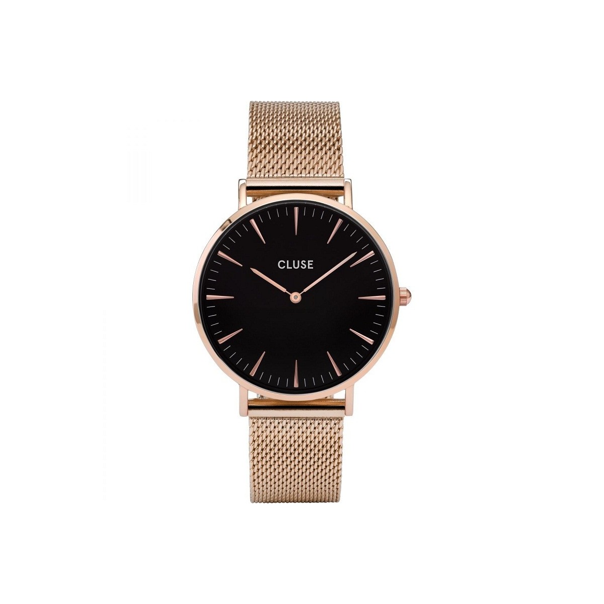 Schrankuhren La Bohème Mesh mit Rosé-Silber-Etui, schwarzes Zifferblatt, Rosewear-Armband und Milanese Trikot.