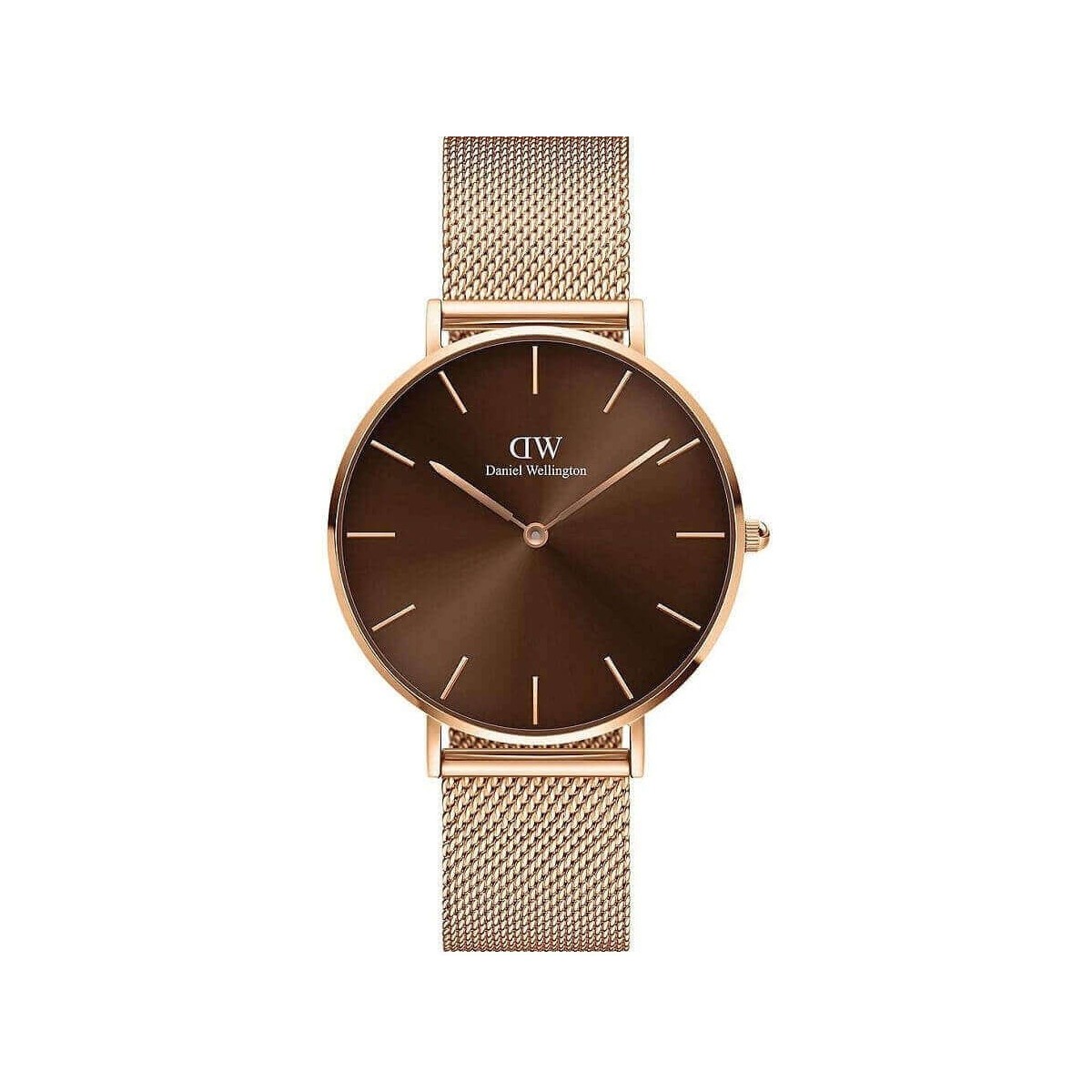 Daniel Wellington Damenuhr aus der Petite Amber Kollektion, nur mit Zeitfunktion und Quarzwerk, gefertigt mit einer zarten Roségoldauflage, das Gehäuse hat einen Durchmesser von 36mm mit einem schokoladenbraunen Zifferblatt.