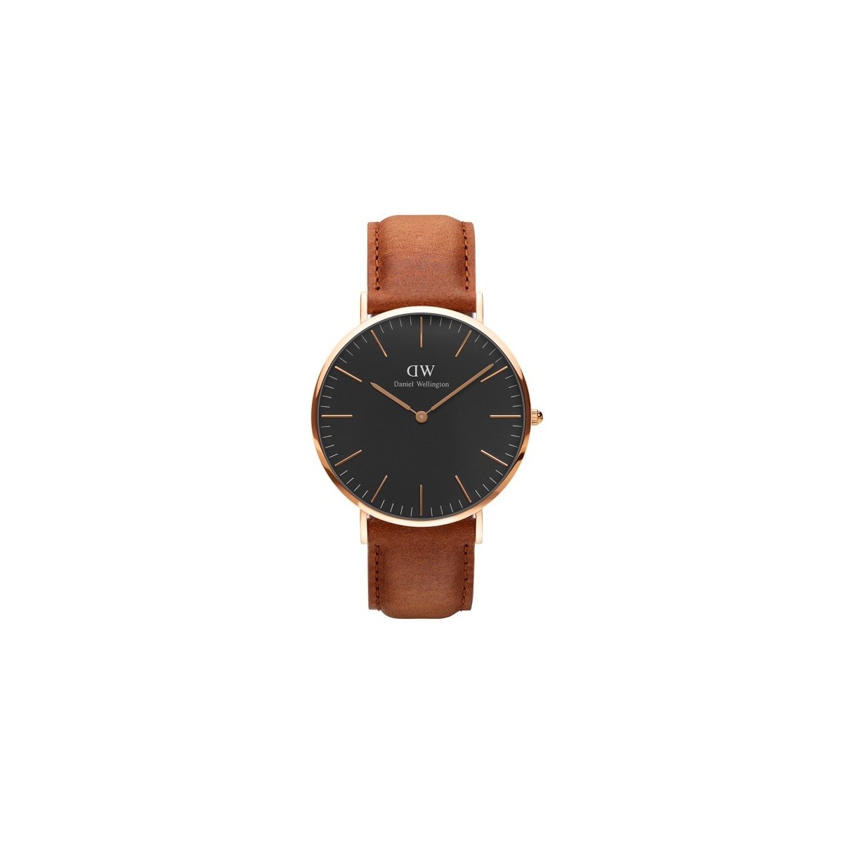 Sehen Sie klassische Black Durham große mit Edelstahl PVD Rosé, mit Zeit einzige Quarzwerk, schwarzes Zifferblatt und Leder Armband leicht braun-DW00100126