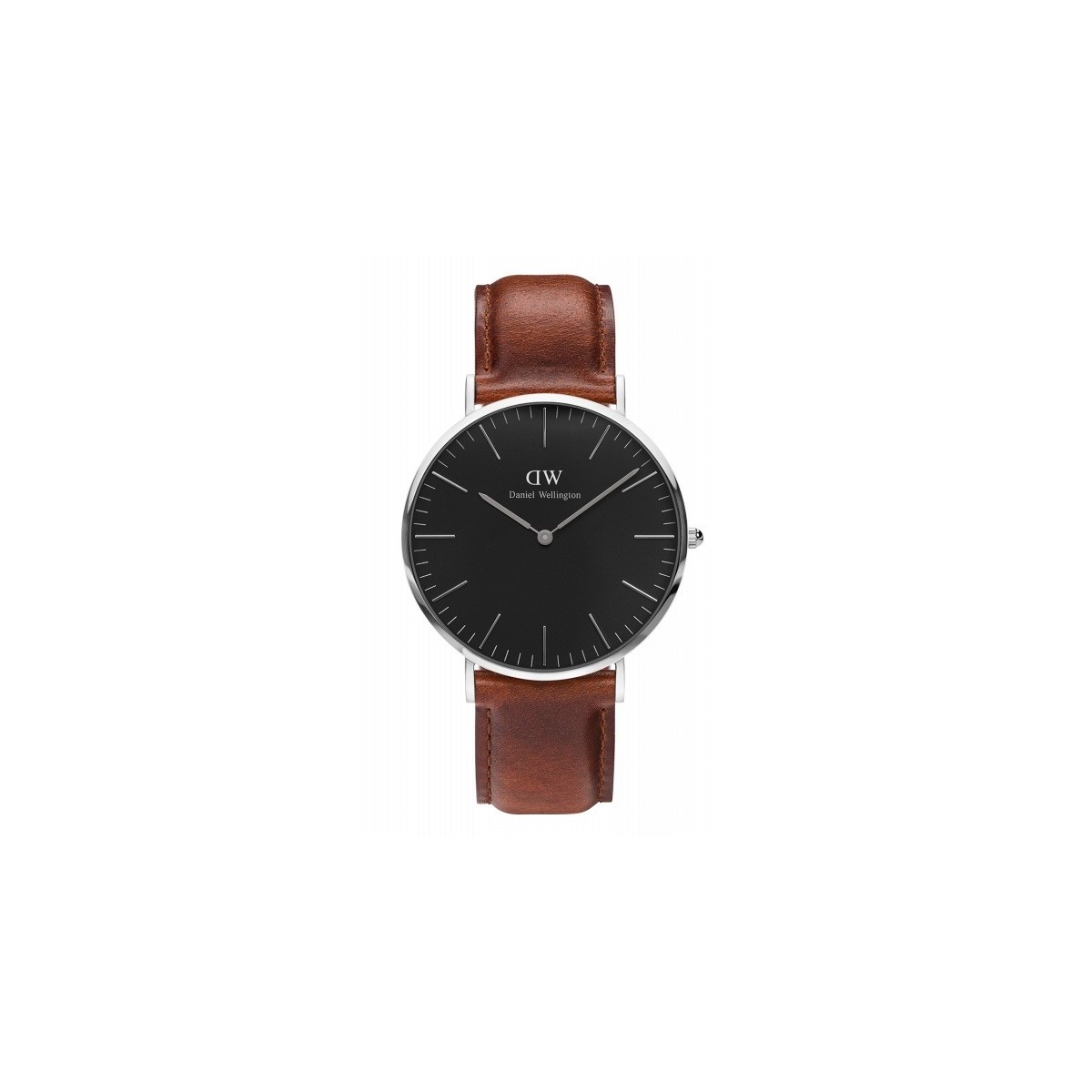 Armbanduhr Classic Black St Mawes mit Edelstahl Silber, Quarzwerk, schwarzes Zifferblatt und Leder Armband Zeit groß glatt nur braun-DW00100130