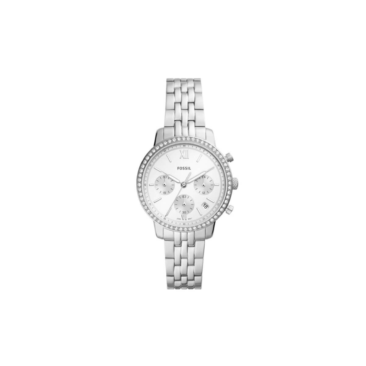 Fossil Damenuhr aus der Neutra-Kollektion mit Chronographenfunktion und Quarzwerk. Die Uhr verfügt über ein Armband aus poliertem und satiniertem Edelstahl, ein 36-mm-Gehäuse mit einer mit kleinen Zirkonen verzierten Lünette, einen Mineralglasständer und ein silbernes Zifferblatt mit drei Chronographenzählern und Lumibrite-Zeigern, abwechselnden römischen Ziffern und Leuchtindizes. Faltschließe.