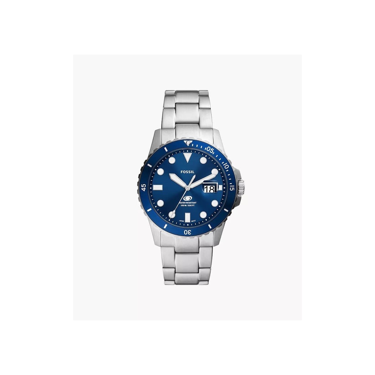 Fossile Herrenuhr aus der Blue-Kollektion mit Nur-Zeit-Funktion und Quarzwerk. Die Uhr verfügt über ein satiniertes Stahlarmband, ein Gehäuse mit 42 mm Durchmesser mit Mineralglasfassung und ein blaues Zifferblatt mit LumiBrite-Indizes und -Zeigern für bessere Sichtbarkeit sowie eine Datumsanzeige mit Lupe bei drei Uhr. Blaue, einseitig drehbare Lünette und Faltschließe.