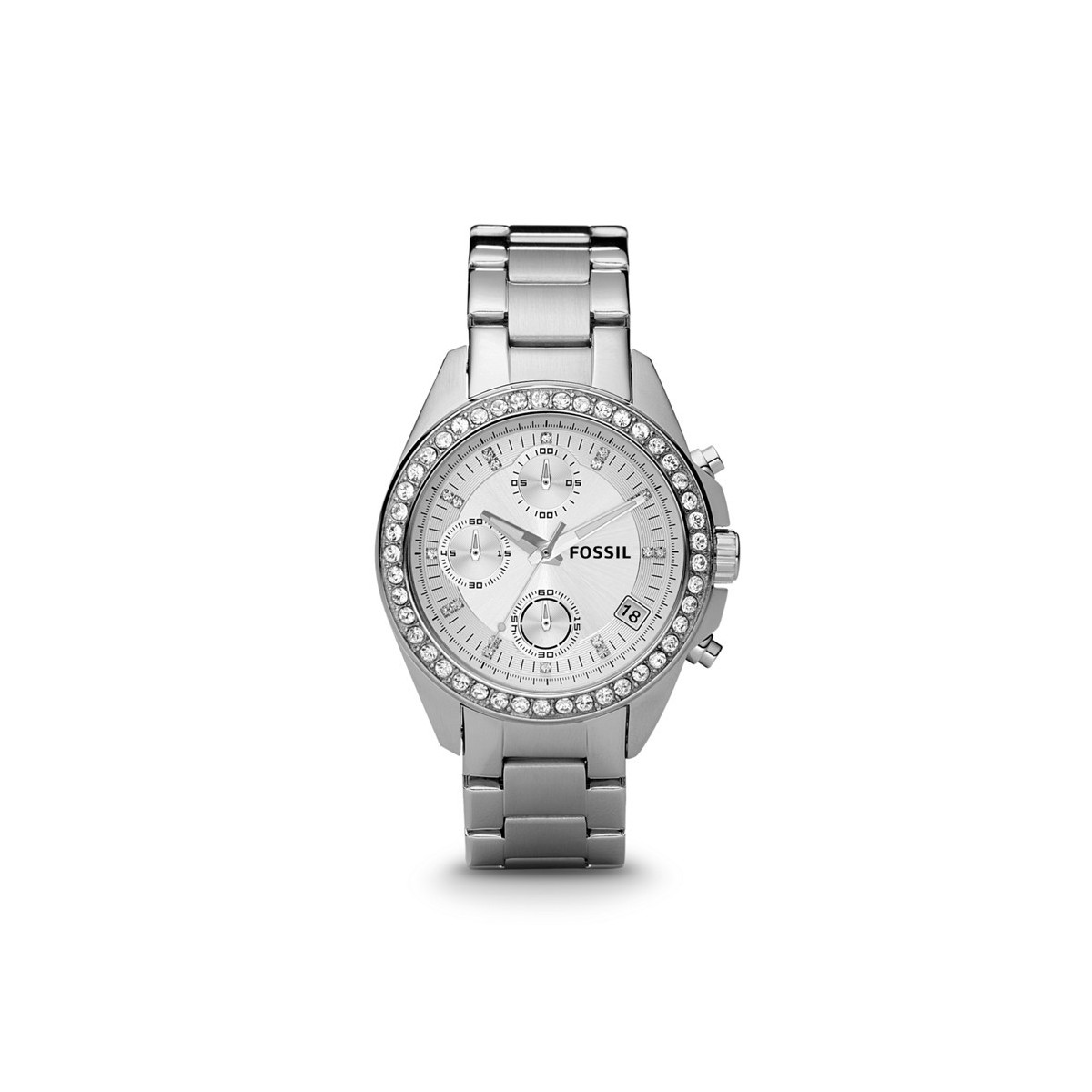 Fossil Decker-Chronograph mit Kristall Akzente rund um das Zifferblatt und Armband ist poliert und gebürstet Edelstahl-Kabeljau: ES2681